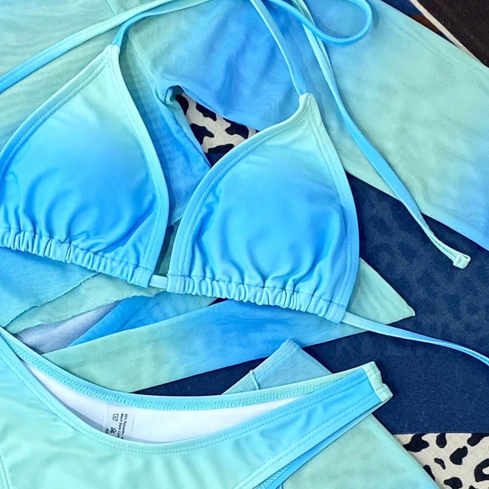 This is big enough to be styled in a multitude of ways! Our oceanic tie dye print swimwear collection offers endless possibilities for a beach-ready look. The wrap-around cropped mesh cover-up with long sleeves is not only chic but also versatile. The slide triangle swim top adds flair to your swimwear wardrobe with its unique upside-down style option. With removable soft padding cups and a self-tie closure, it ensures a comfortable and customizable fit. Pair the slide triangle top with the high cut leg bikini bottom, boasting a cheeky back, to show off your curves while maintaining a playful and trendy look. And when you need a quick cover-up, our fitted mesh skirt is the ideal option, adding an extra dose of elegance to your beach attire.
