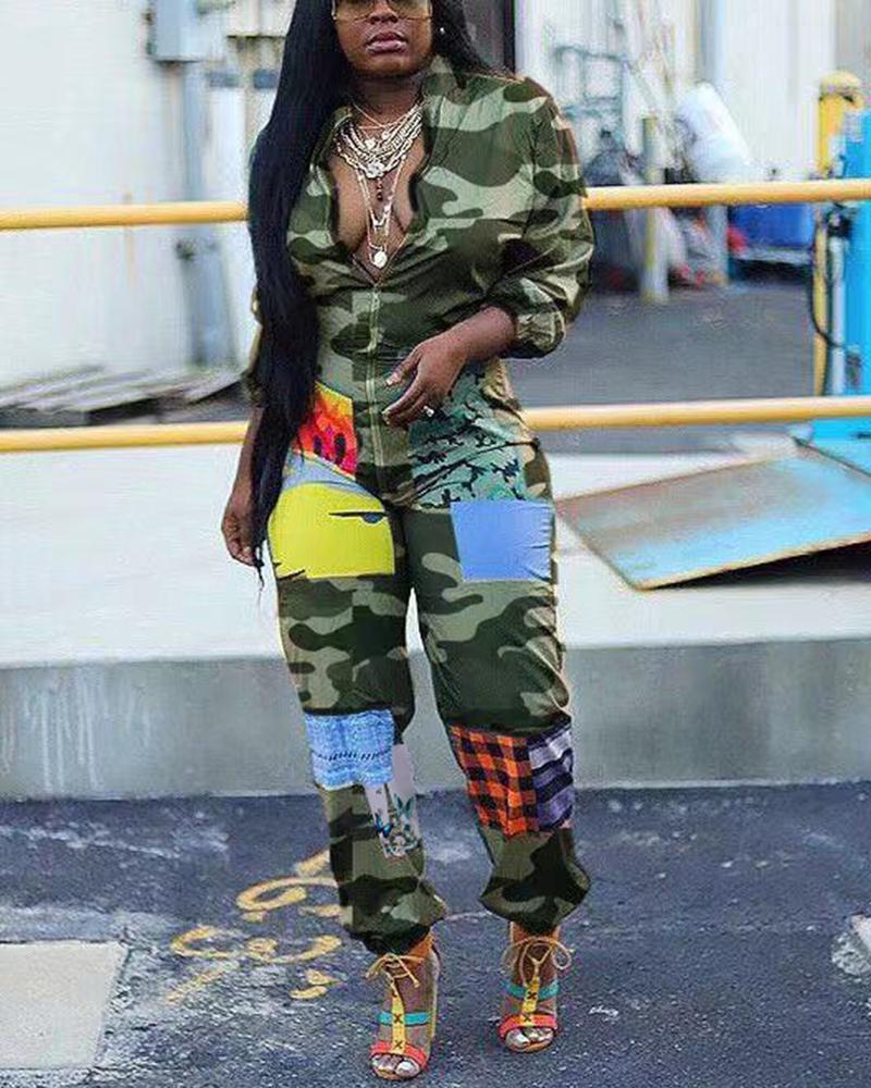 Patchwork Print Zip Up Elastic Leg Casual Jumpsuit