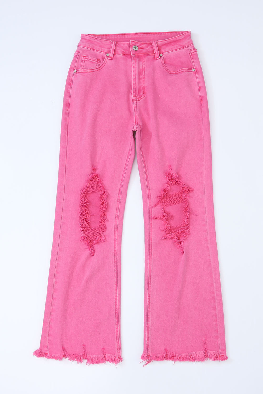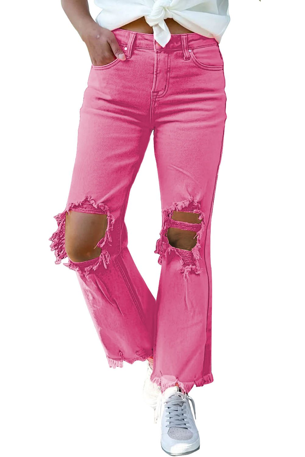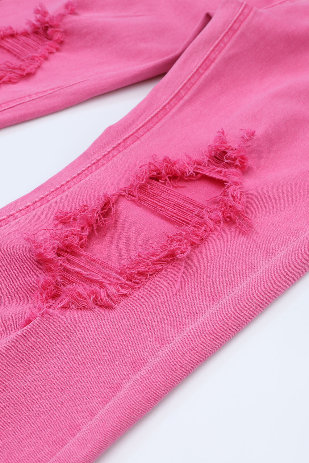Pink Distressed Holes Raw Edge Cropped Flare Jeans