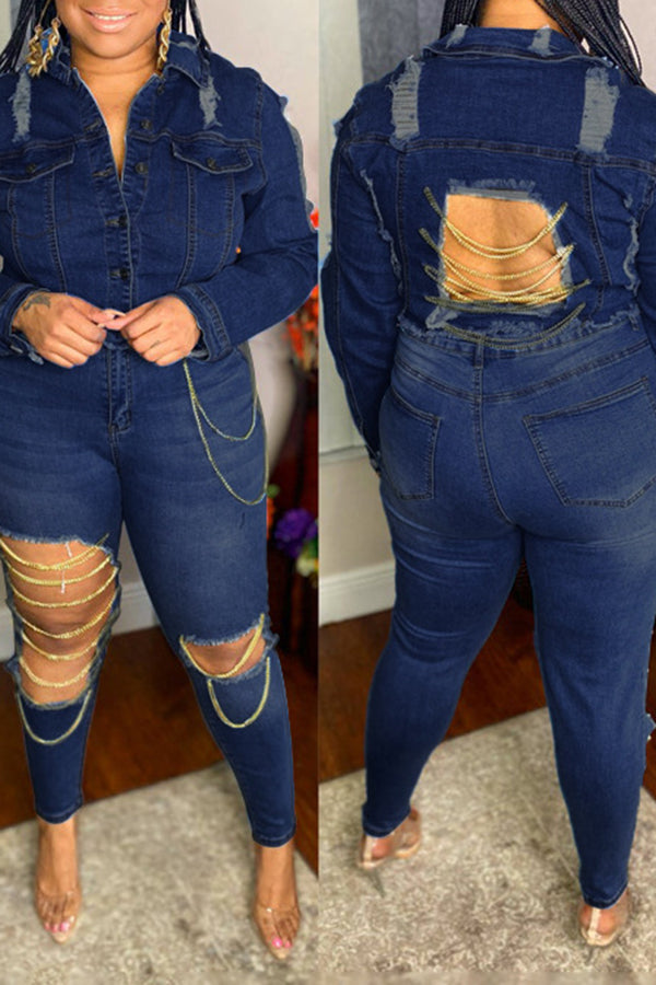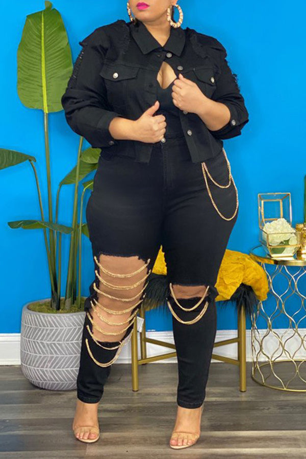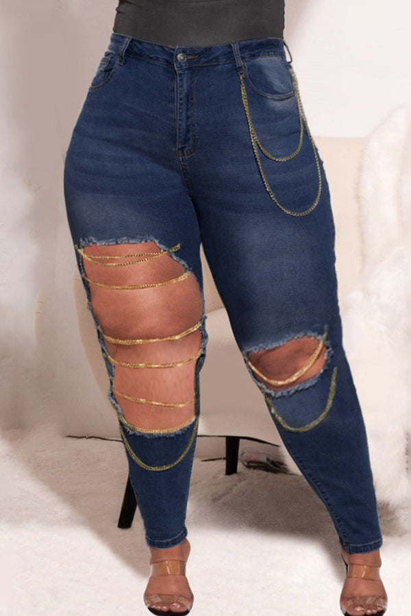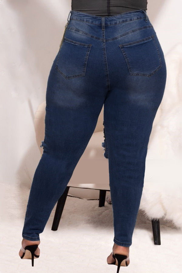 Plus Size Slim Fit Ripped Chain High Stretch Jeans
