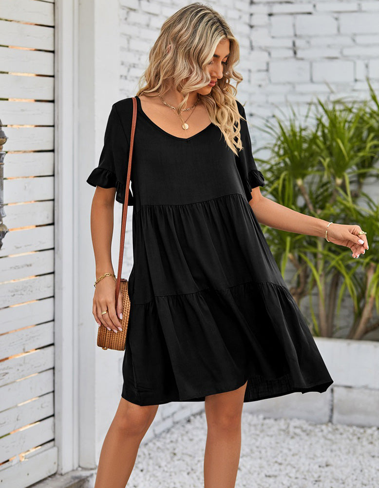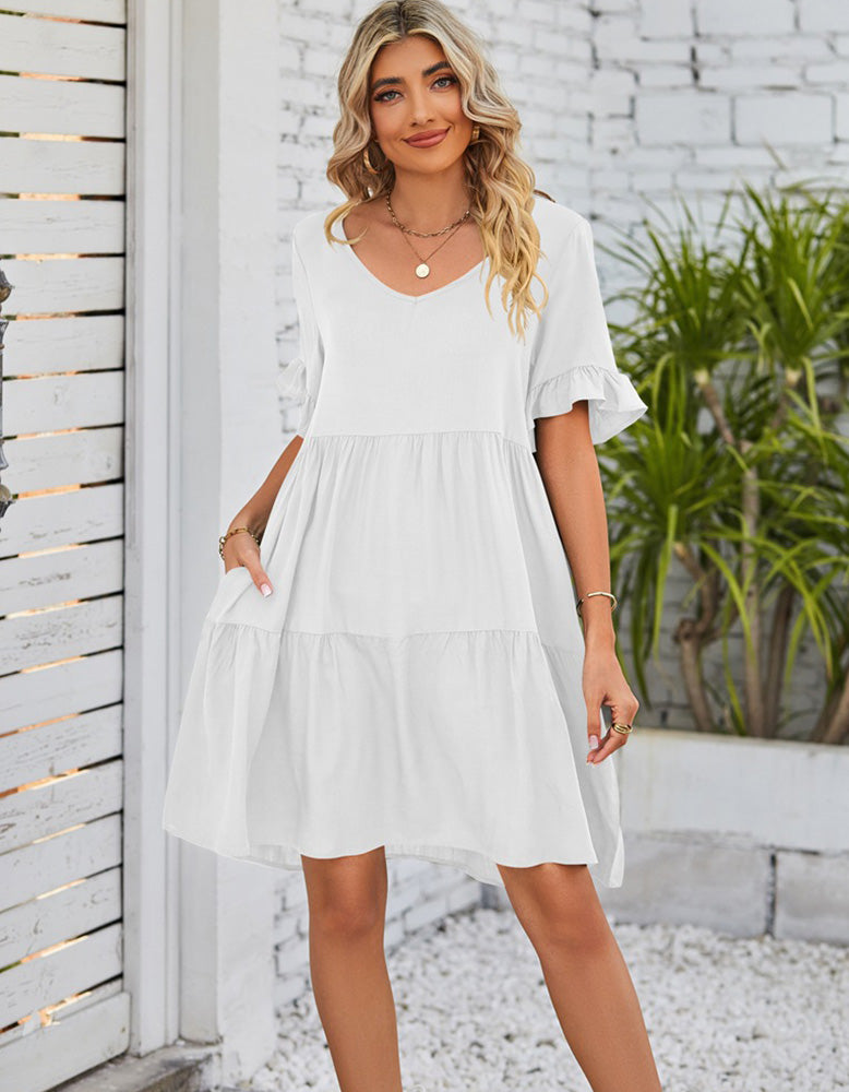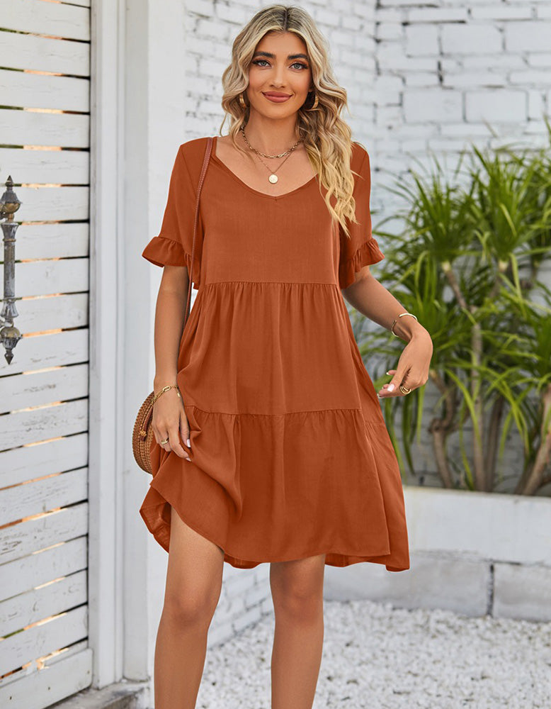 Plain Flounce Sleeve Pleated V Neck Midi Dresses