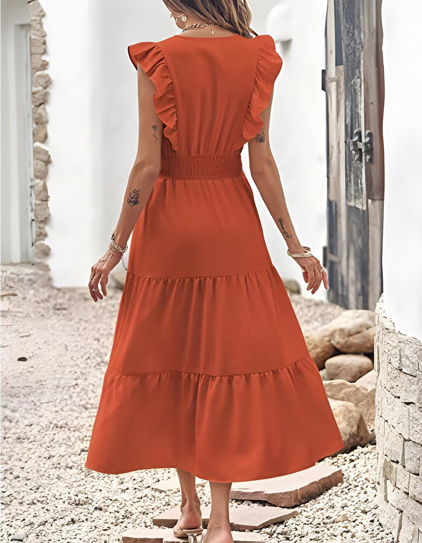 This Plain Sleeveless V-Neck Midi Pleated A Line Dress is perfect for any casual occasion. You can choose from five colors: black, white, orange, green, and red. Its solid-color pattern is complemented with pleated and ruffle details, and a loose waist and midi-length hem give it an elegant, A-Line fit. Crafted from a lightweight blend of polyester and spandex, this is a comfortable and stylish choice.