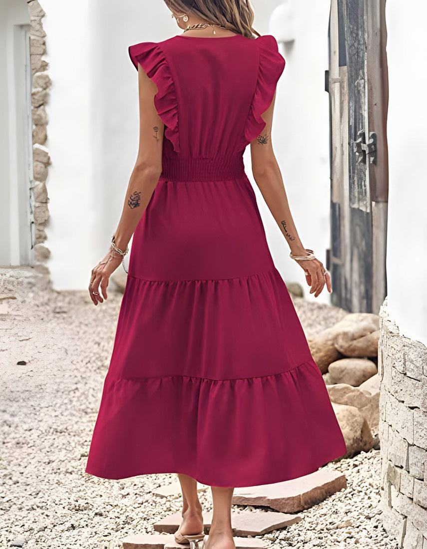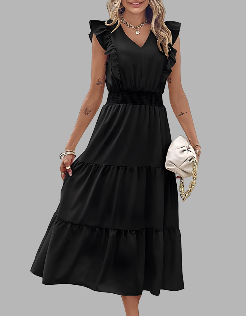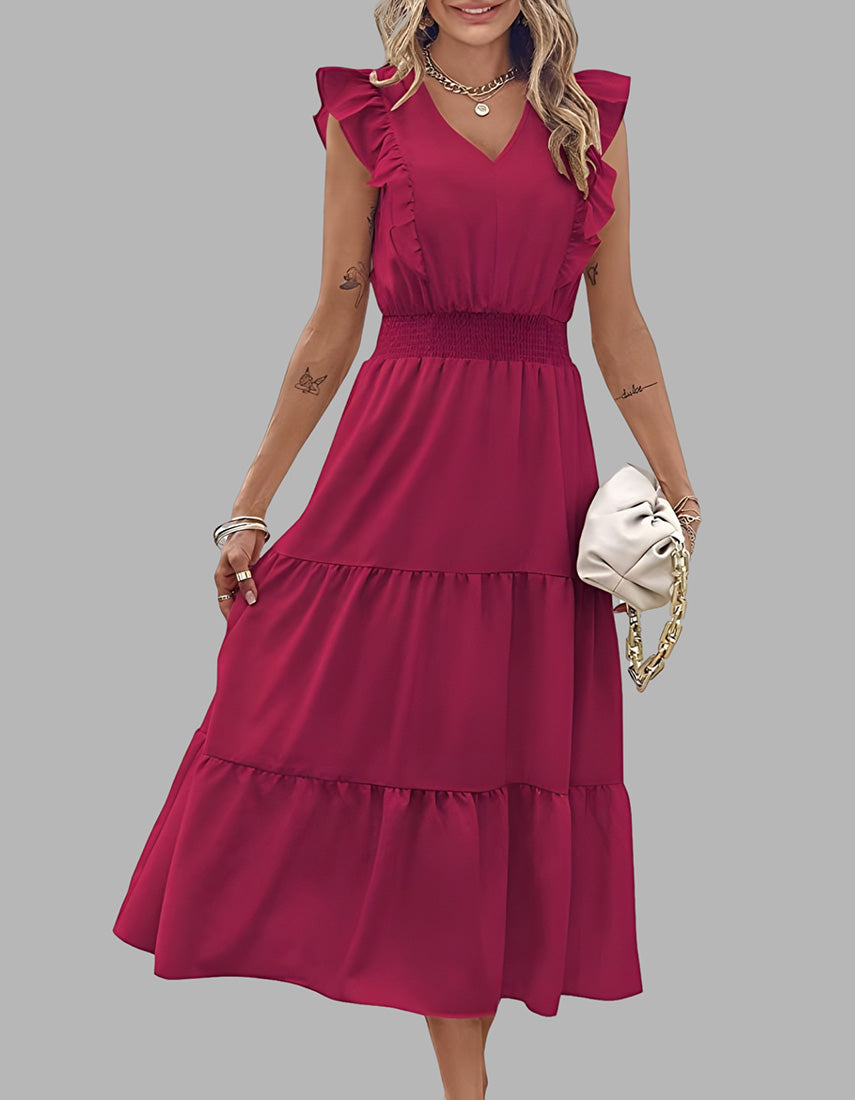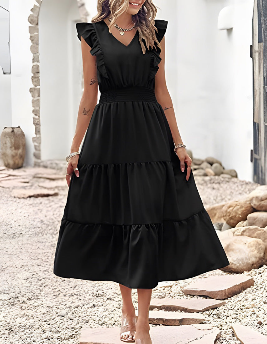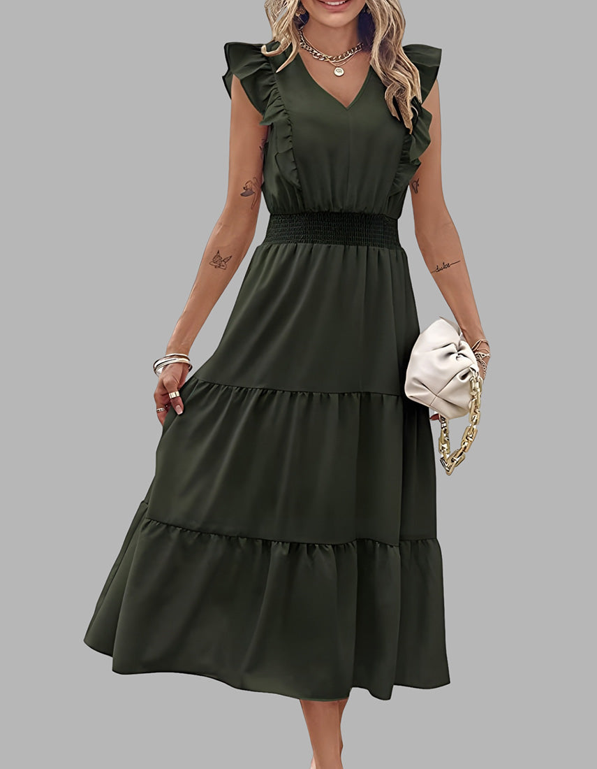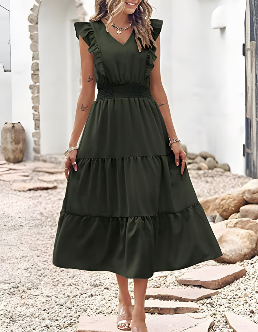Plain Sleeveless V-Neck Midi Pleated A Line Dresses
