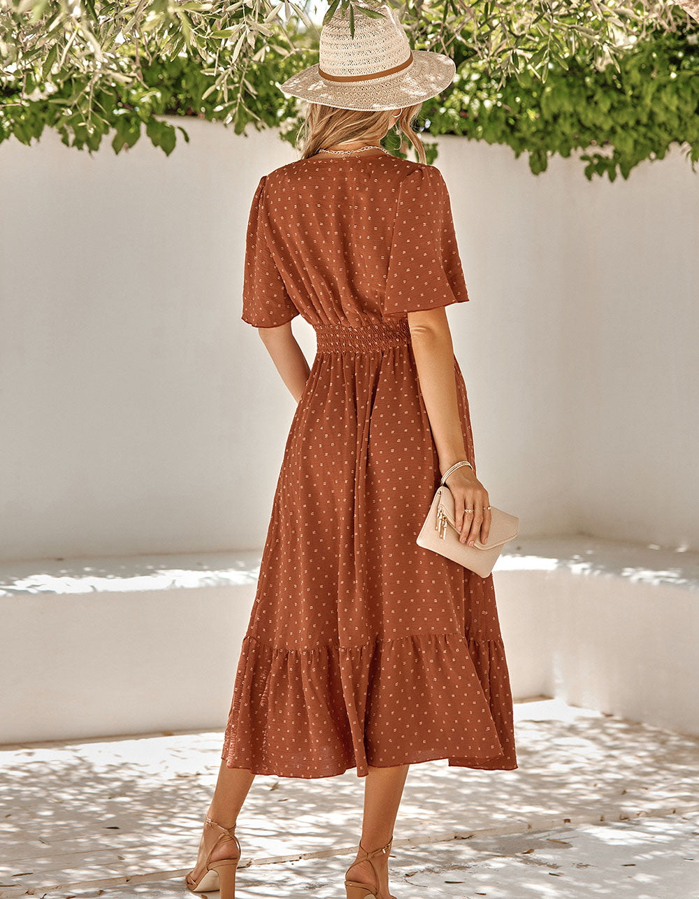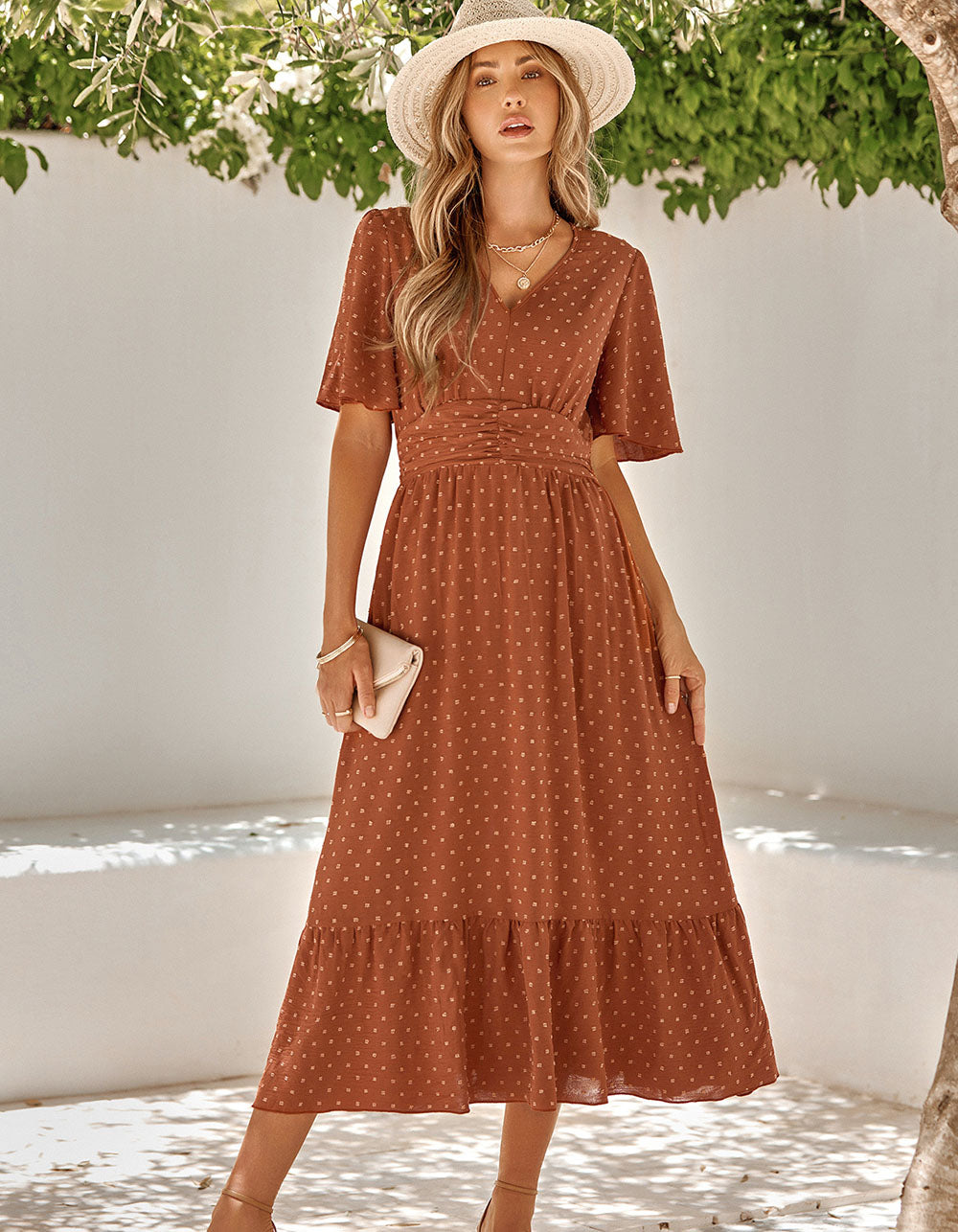 This stylish A-Line dress features a flattering V-neckline, short flounce sleeve and an elegant mid-waist silhouette, crafted from a lightweight yet durable polyester fabric. The dress is adorned with pleated ruffle detailing and comes in almond, green, and red color options. Perfect for both casual and formal occasions.