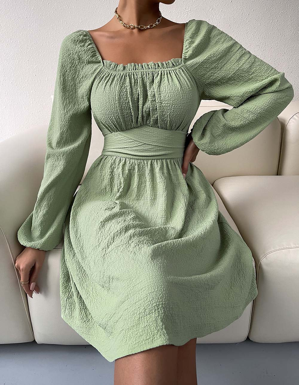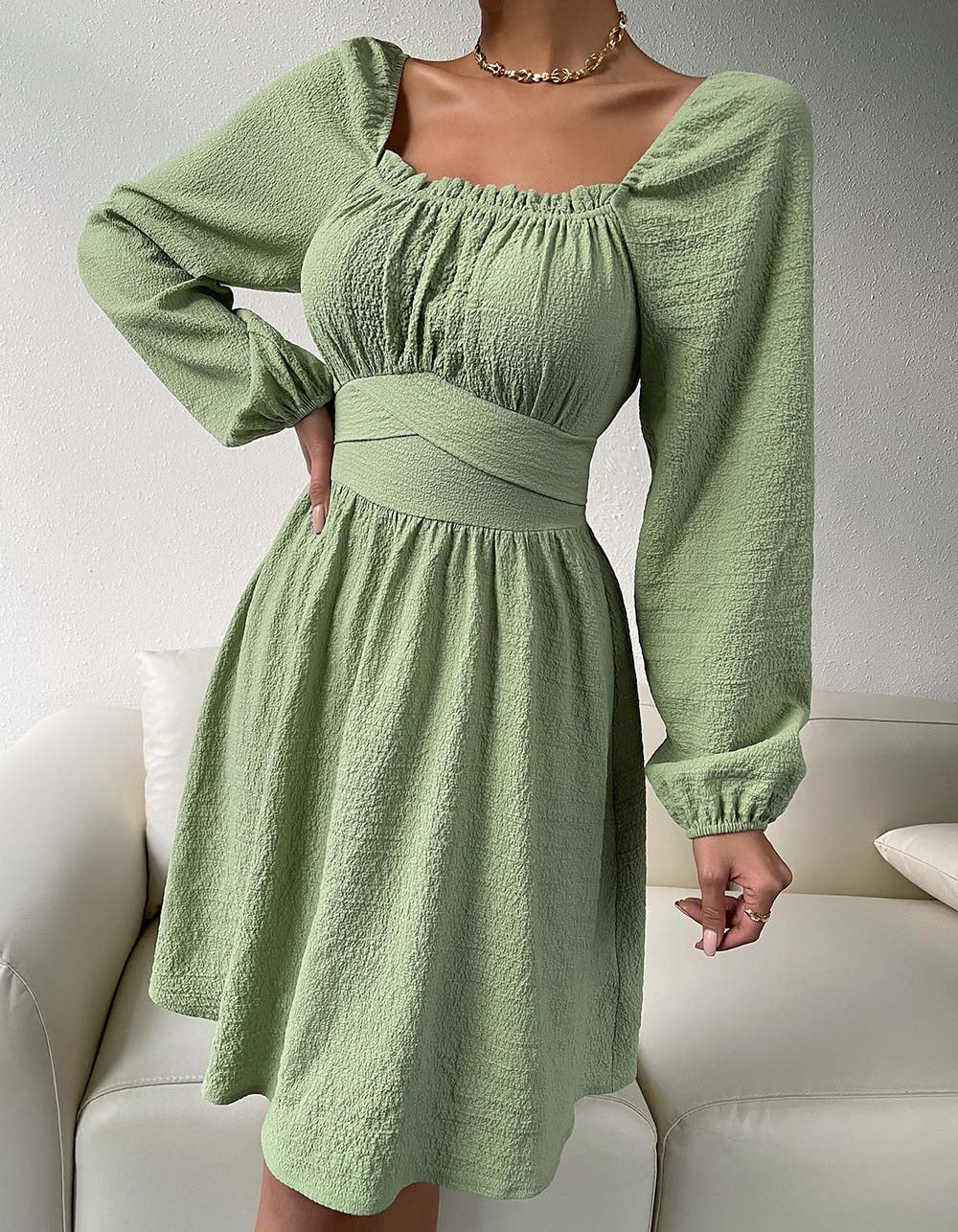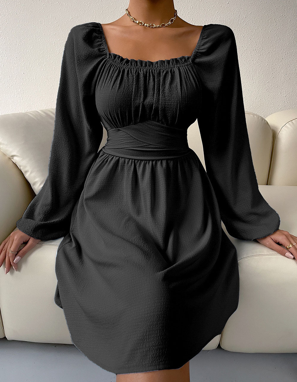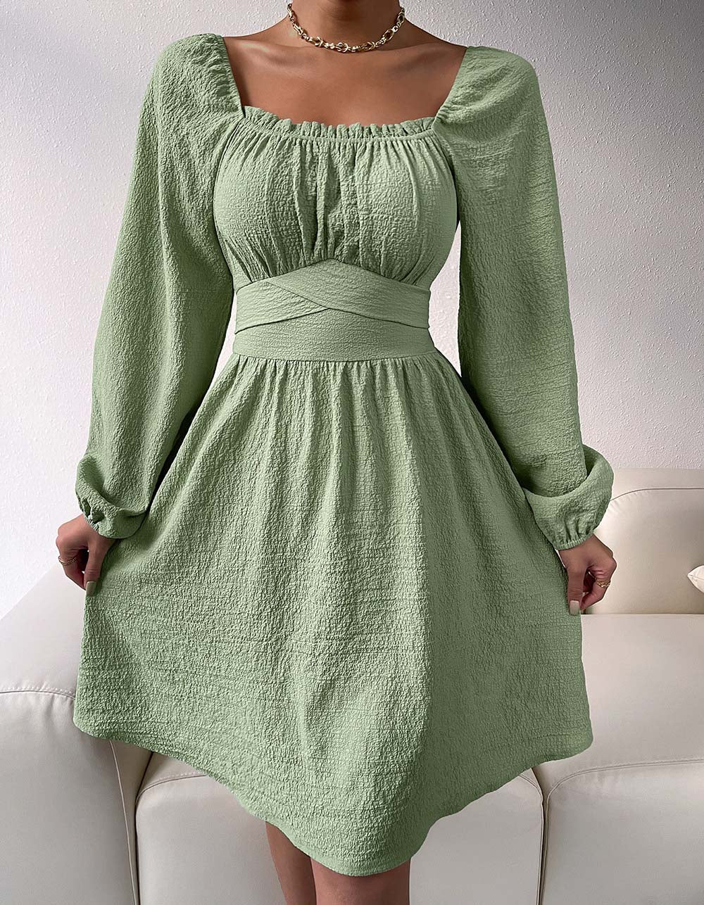 Plain Square Neck Long Sleeve High Waist Belted A-line Dresses