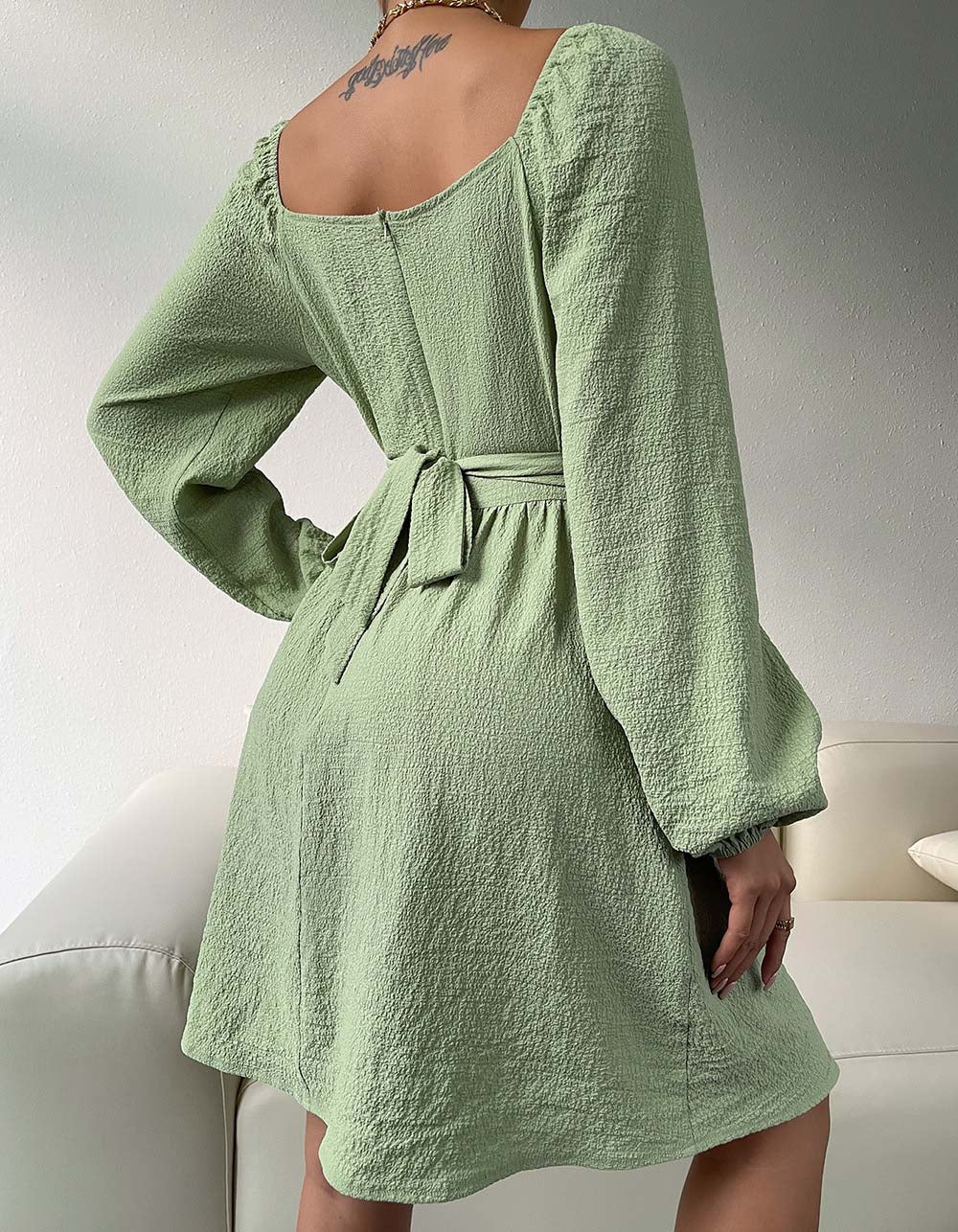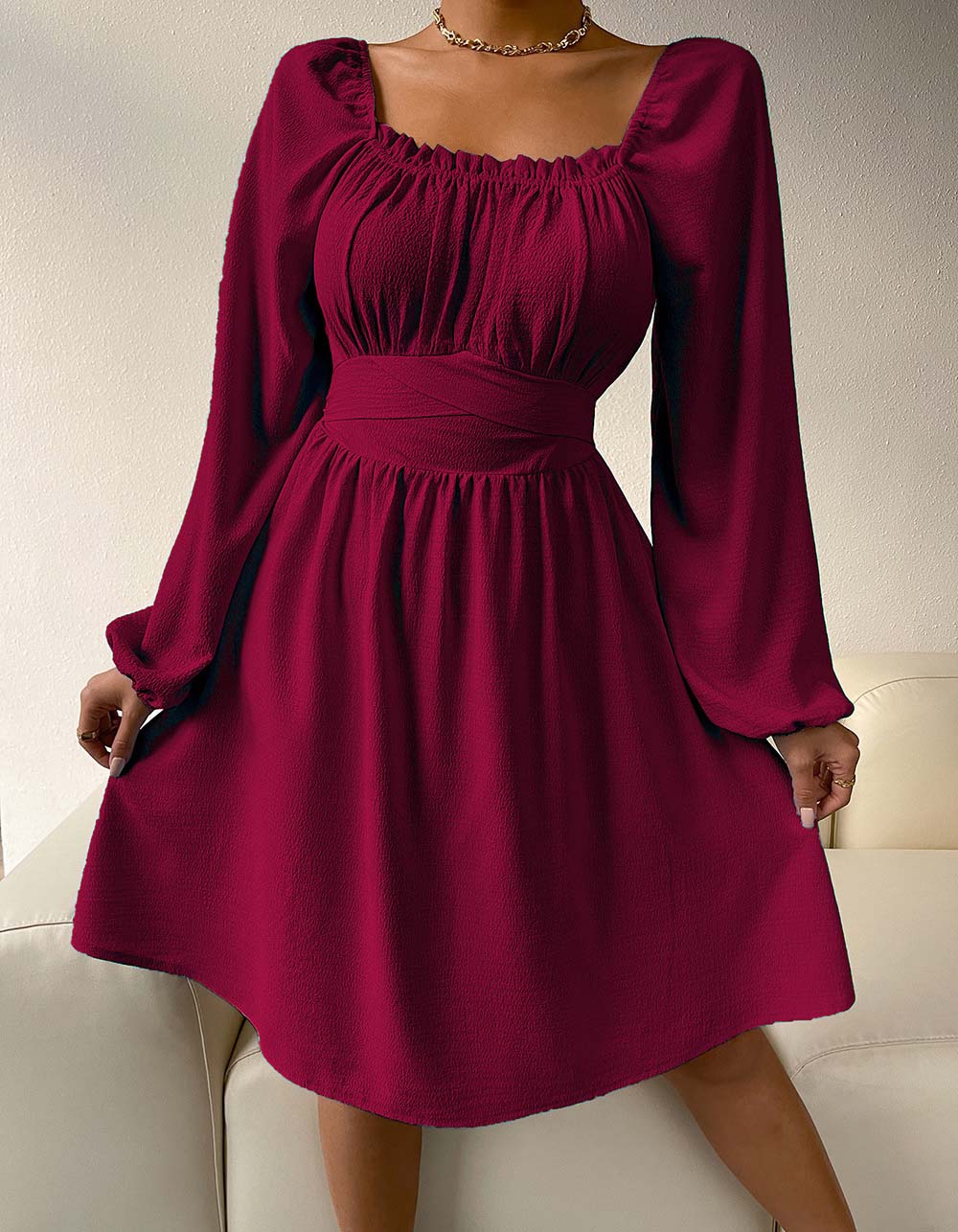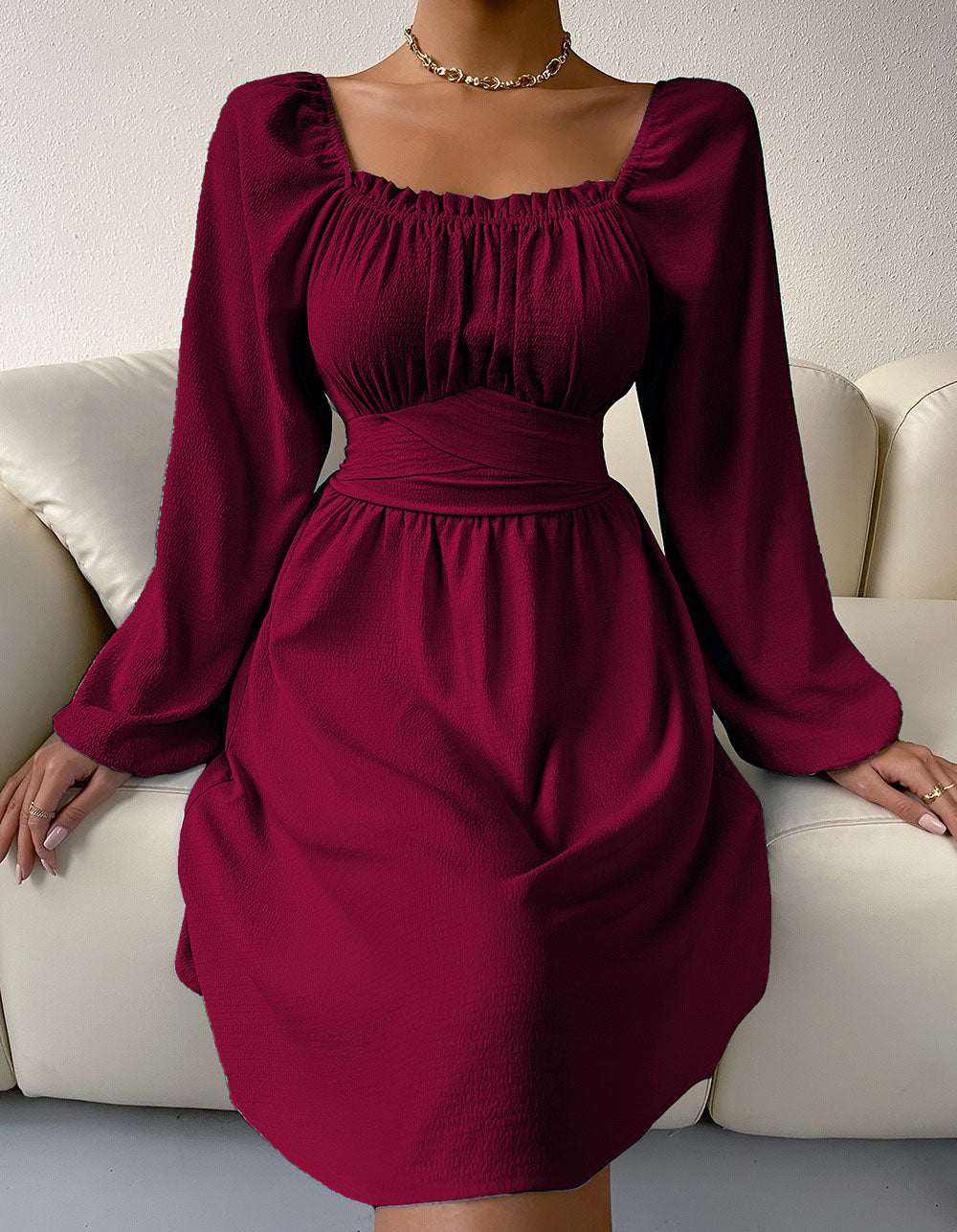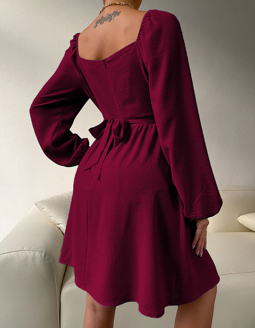 This A-line dress features a stylishly square neckline with long sleeves, high waist and tie-back detailing. Crafted with a slight-stretch polyester fabric, it is comfortable and perfect for any casual or elegant occasion. Available in white, claret, light blue, black, or green.