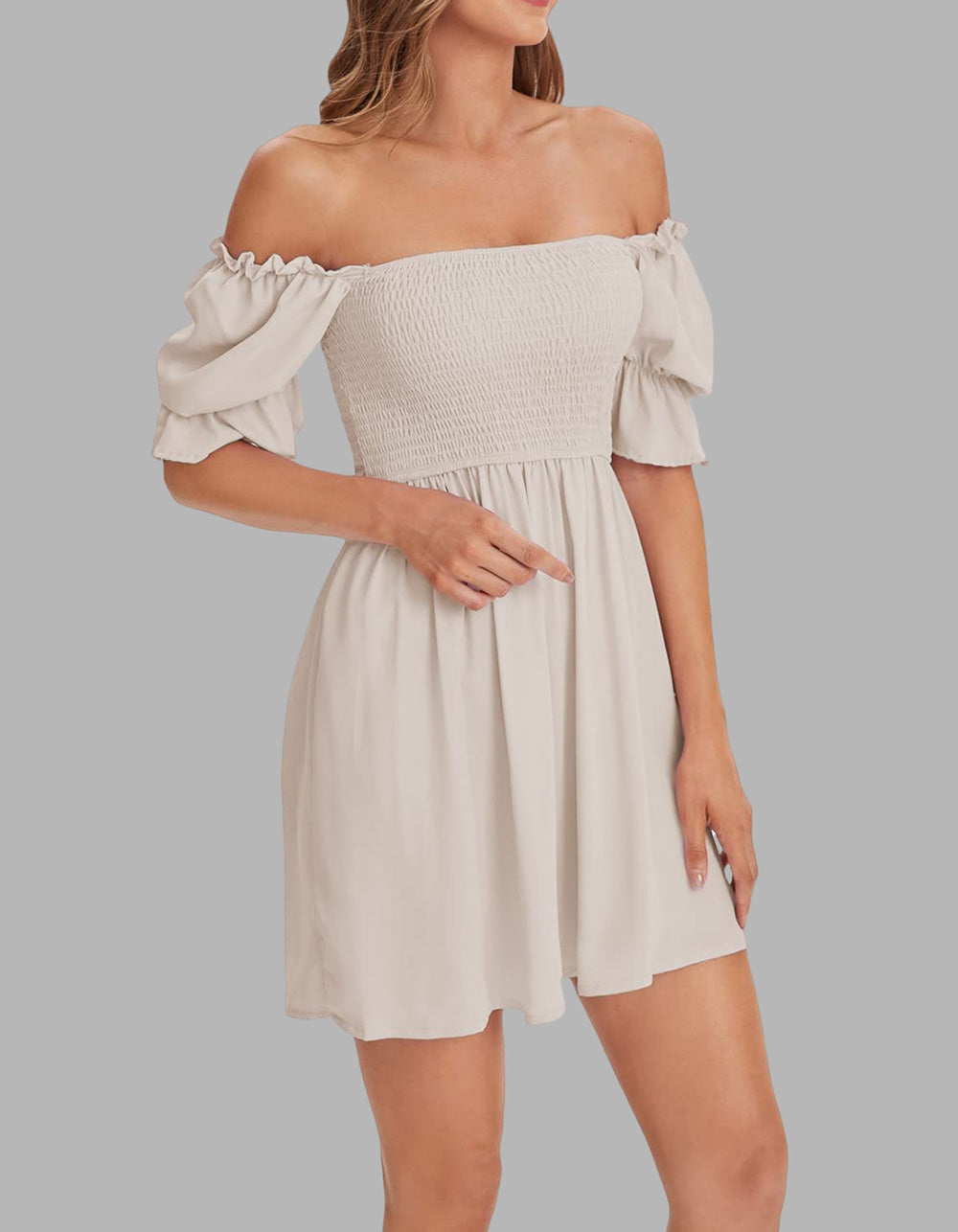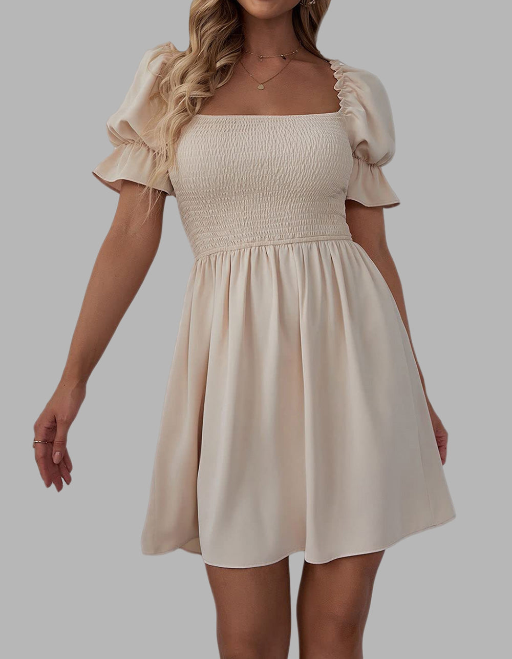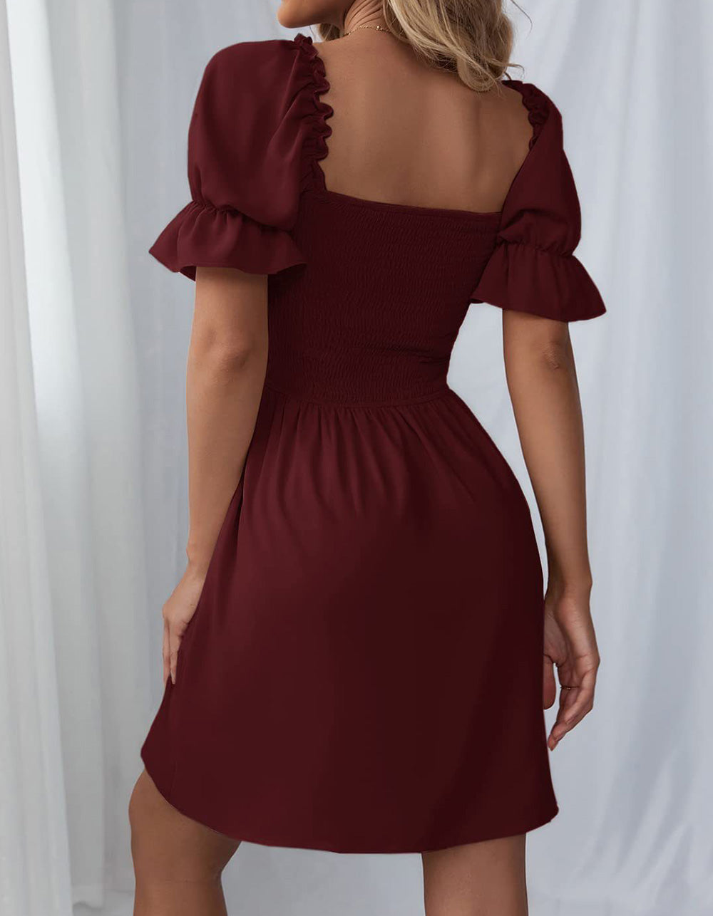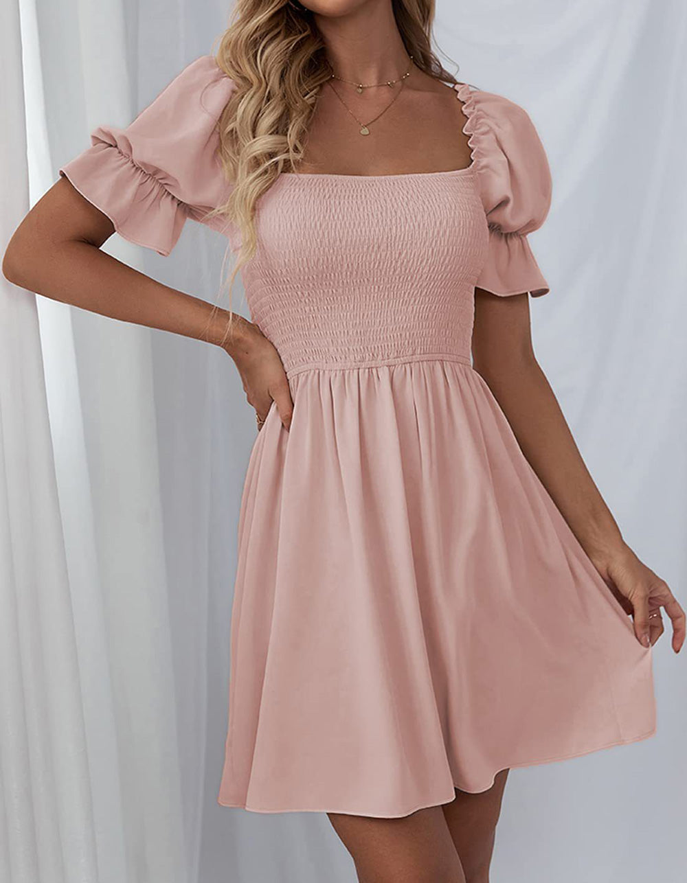 Plain Square Neck Ruffle Short Sleeve Pleated A Line Dresses