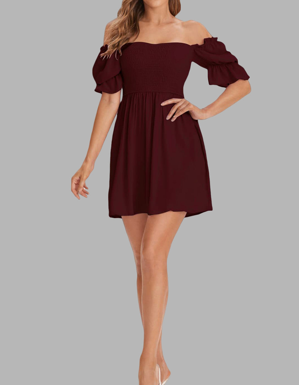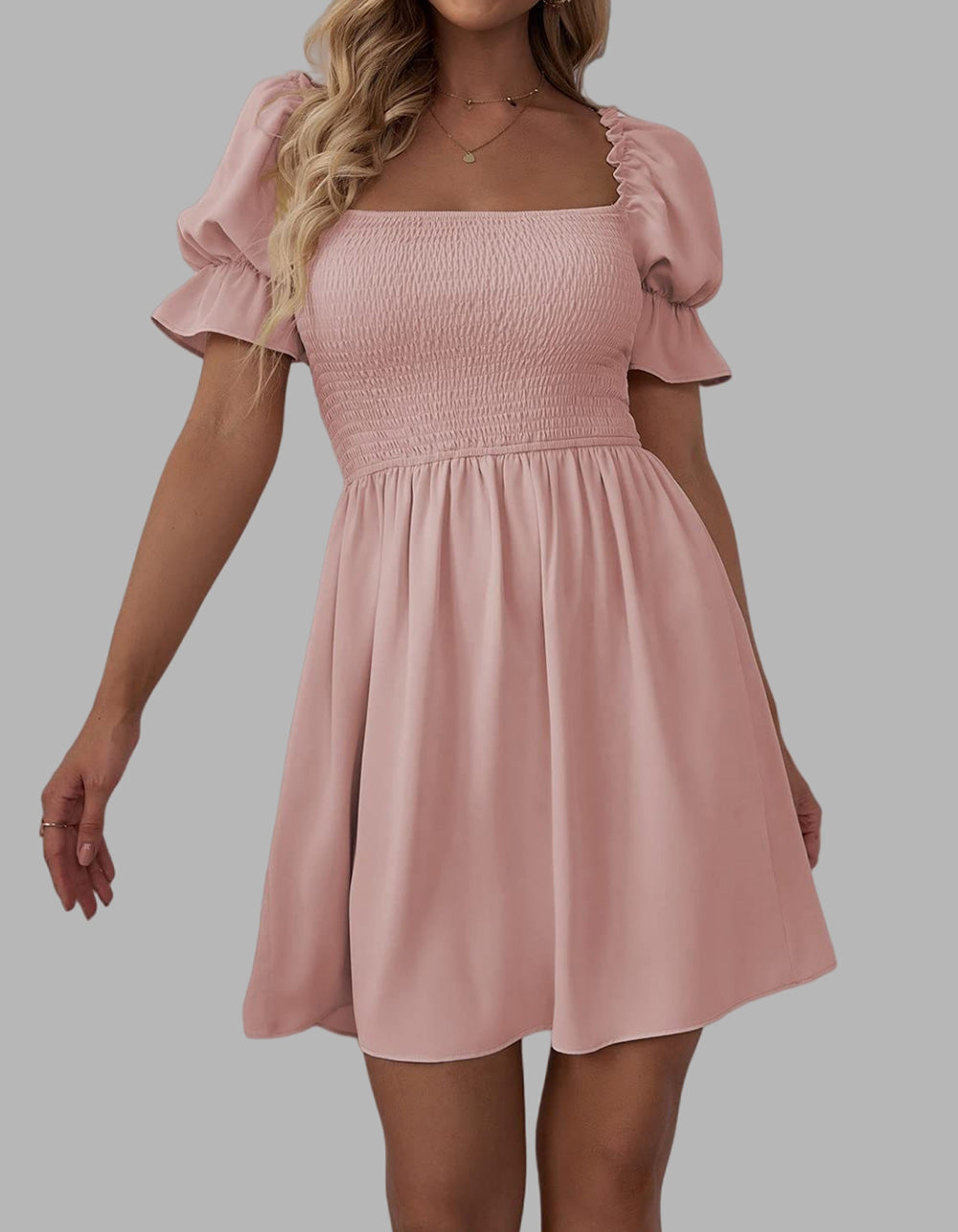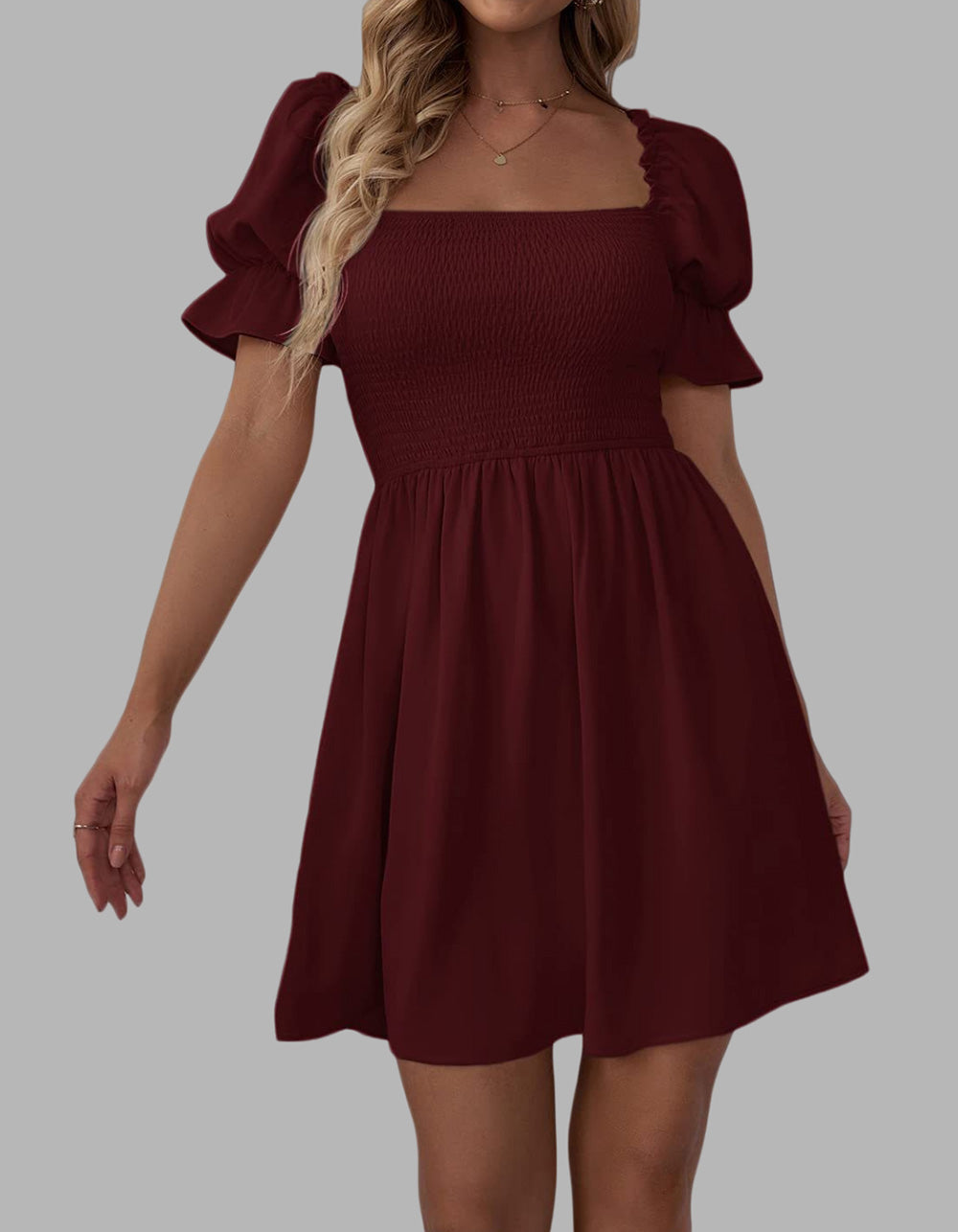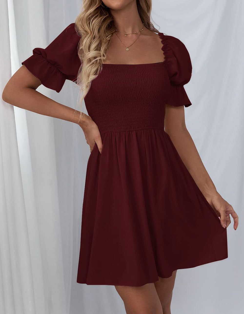 This Plain Square Neck Ruffle Short Sleeve Pleated A Line Dress is the perfect addition to your wardrobe. Made with lightweight and breathable Polyester fabric, this dress features a casual yet elegant style, solid-color pattern, high-waist, square neckline, and short sleeve puff design. The pleated and ruffle hem detail gives this dress a delicate touch that will surely turn heads. Available in Black, Almond, Pink, and Claret.