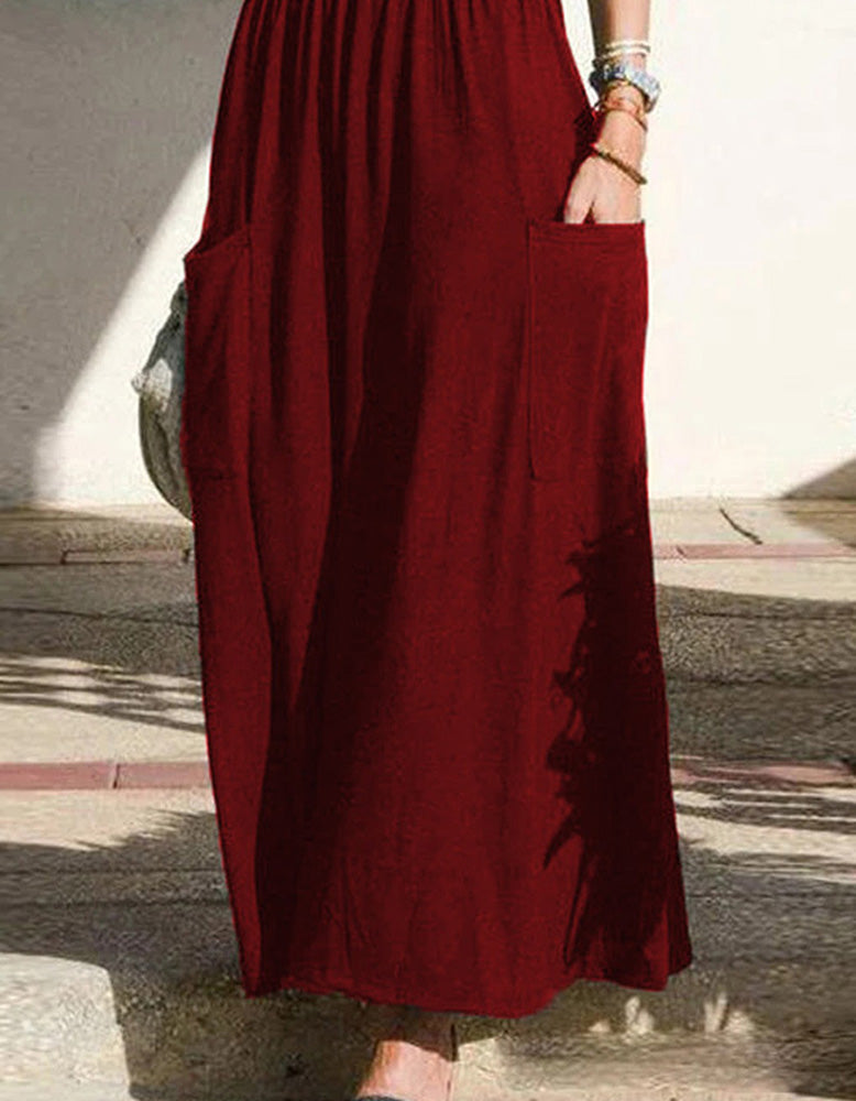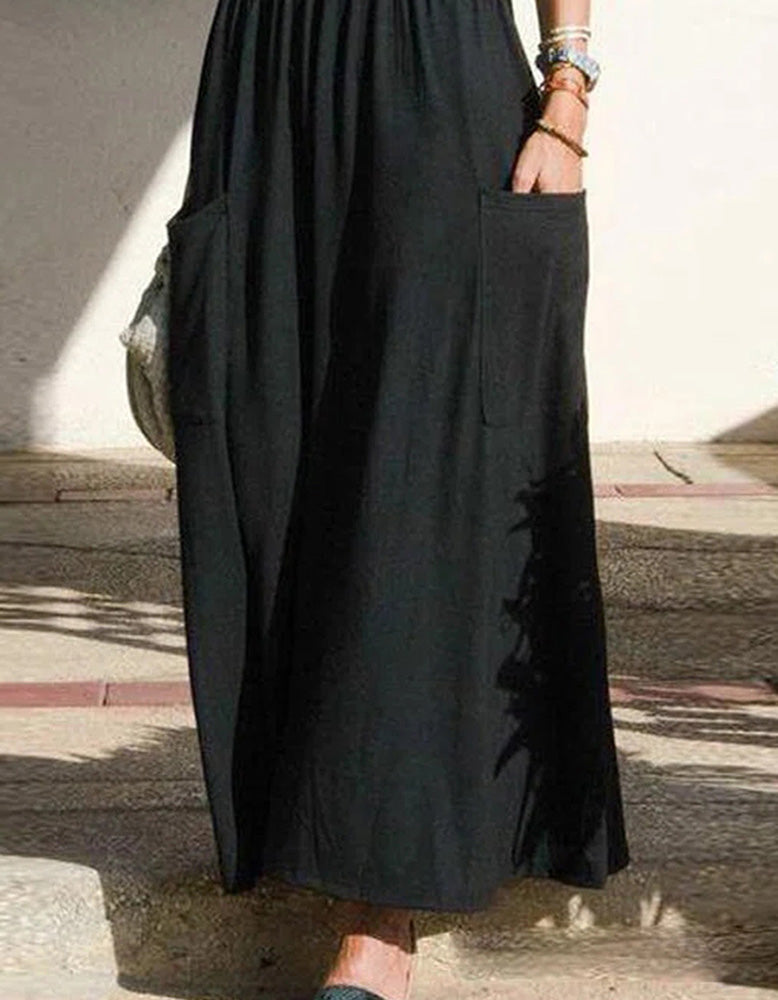 Plain Strap Pocket Pleated Long A Line Dresses