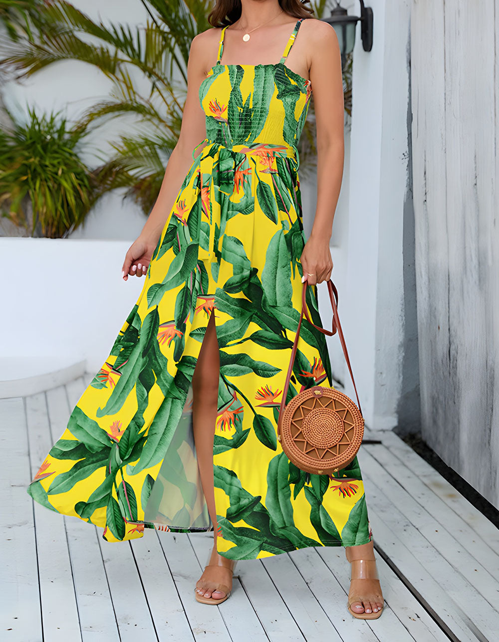 Plants Print Bohemia Slits Strap Long A Line Dresses