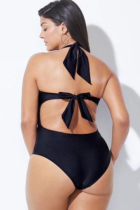 Sexy plus size one piece bathing suit featuring a bowknot design on the front with ruched details, suspender halter straps tied on neck, removable padding cups, cutout trim on the front with tied back straps, moderated coverage bikini bottom, allover in solid color.