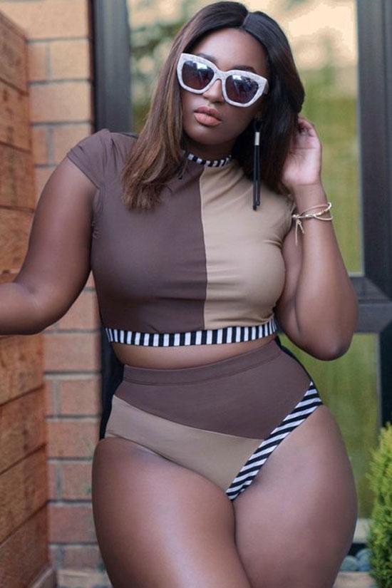 Trendy plus size two piece bikini set featuring a crop t-shirt styling swim top with cape sleeves, detachable padding cups, stand collar, wild band in contrast stripe printed, and a high waisted bikini bottom in color combination.