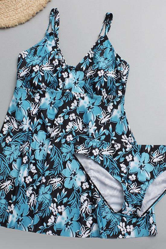 Tropical two piece bikini swimdress set featuring a flare hem swim dress in blooming floral printed, removable padding cups, suspender shoulder straps, pairing with a bikini bottom in moderated coverage.