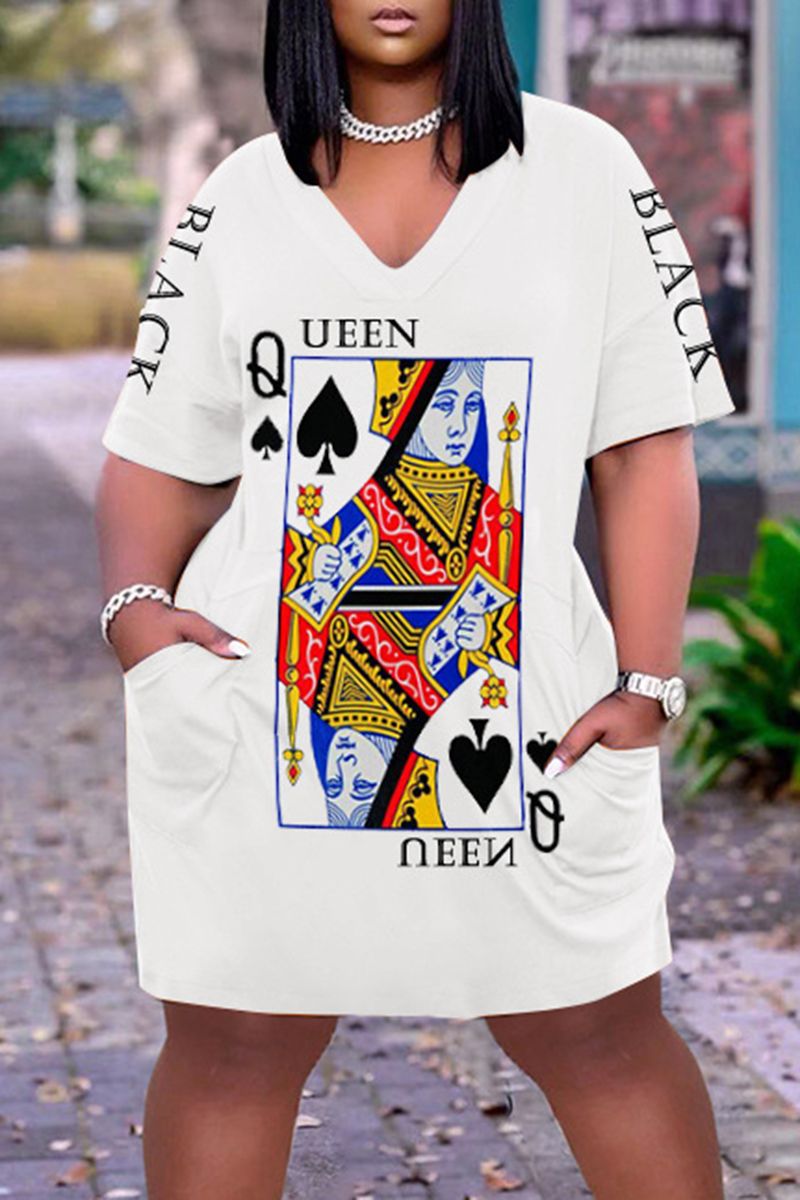 Poker Print Slant Pocket V Neck Dress