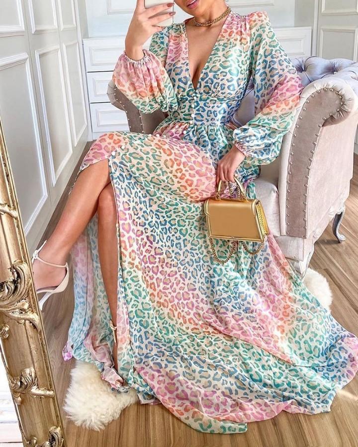 Puff Lantern Sleeve High Slit Colorblock Cheetah Print Dress