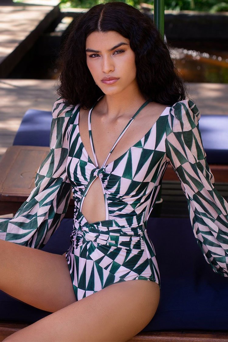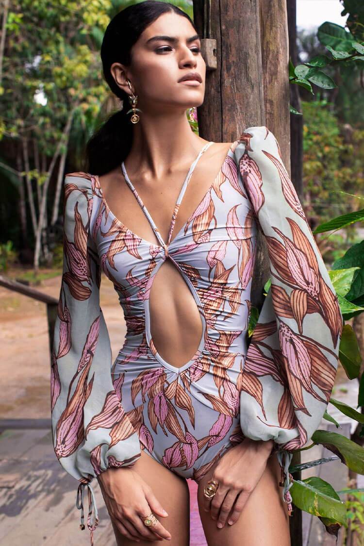 Gorgeous one piece swimsuit featuring a plunging neckline, adjustable shoulder straps, puff long sleeves with drawstring cuffs, cut out trim on the front and back, detachable pad cups, and moderated fit bikini bottom in tropical plant pattern.