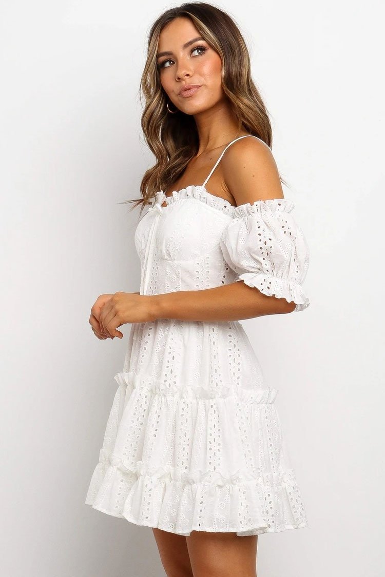Exquisite mini dress featuring sweetheart neckline with frill trim, detachable short sleeves, bowknot trim on the front, stringy-selvedge trim, openwork design overlay, and flare hemline. Wear this sweetest little white sundress for summer.