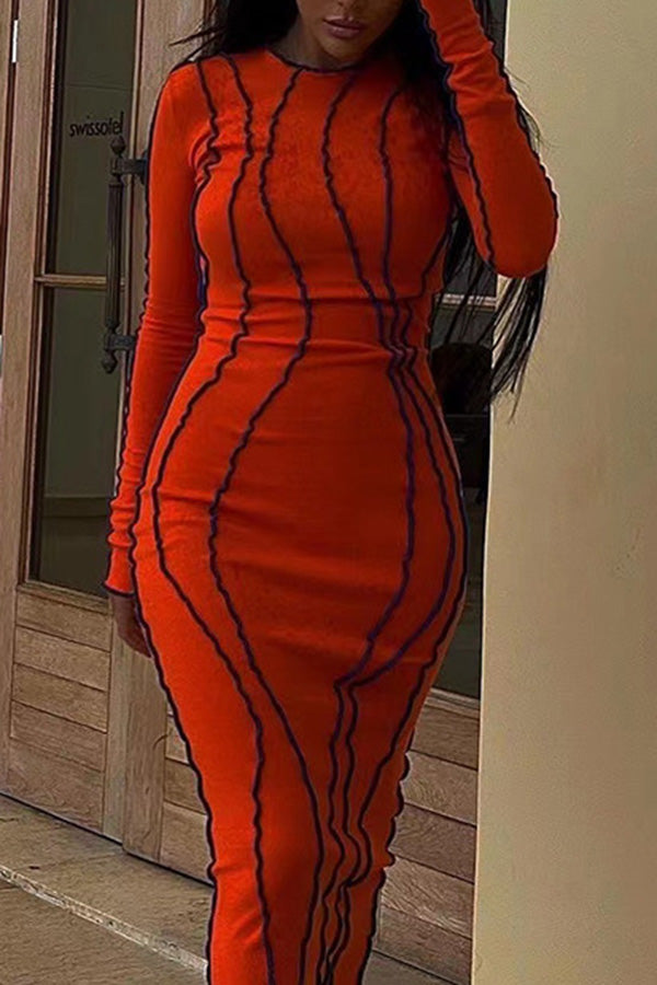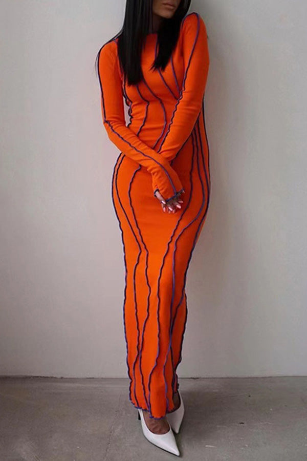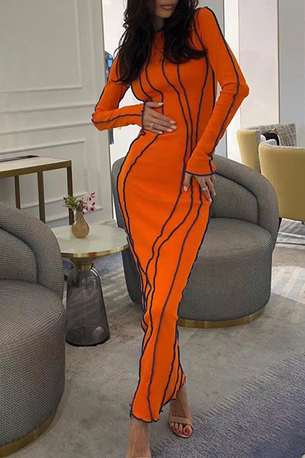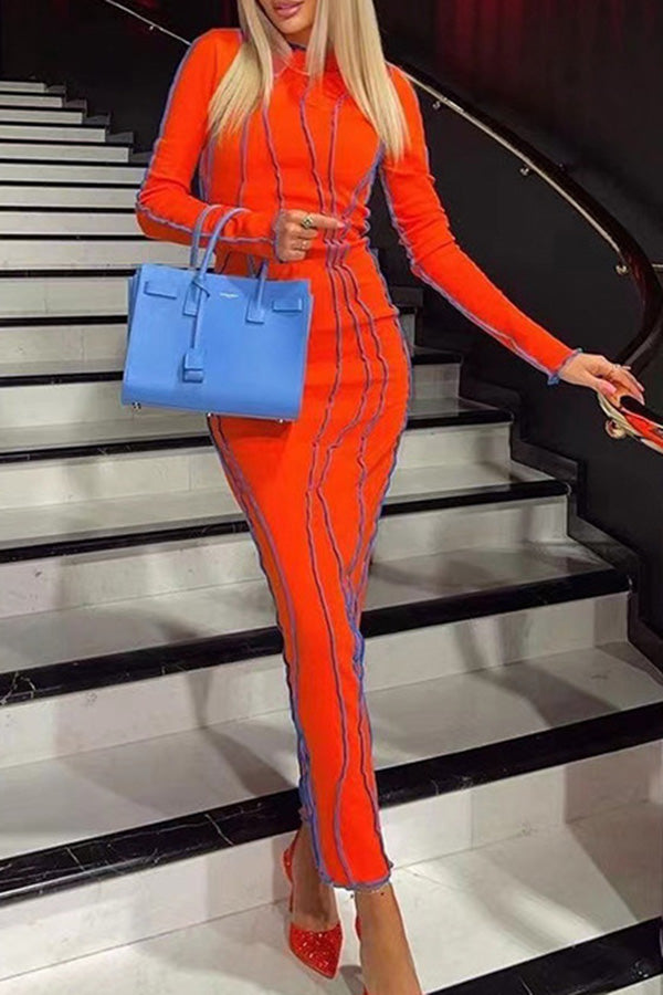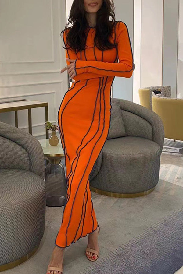 Sexy Color Contrast Edge Slim Elastic Long Sleeve Maxi Dress