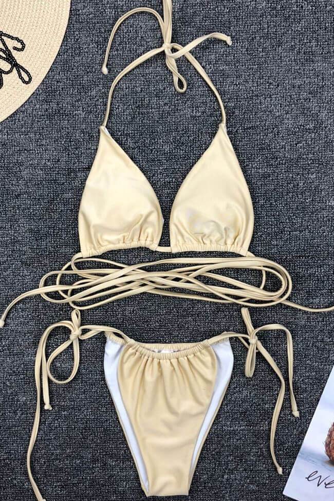 Super sexy two piece bikini set featuring a sliding triangle bikini swim top with removable paddings, self tie straps on neck and strappy around body, and a pair of cheeky bikini bottom with tie sides. Allover in solid color.