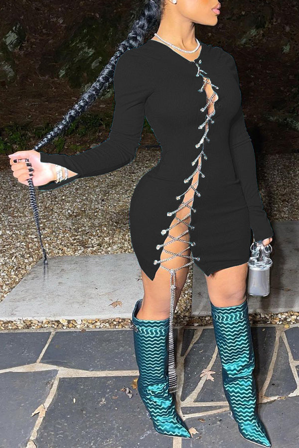 Sexy Cutout Lace-Up Solid Color Long Sleeve Mini Dress