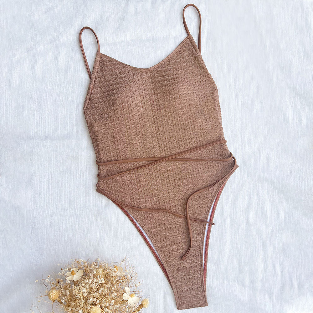 Dive into retro vibes with our sexy textured bathing suit! This playful swimsuit is all about fun in the sun. The retro brown color will make you stand out, while the V-cut neckline adds a touch of flirty flair. What makes it truly unique? Extra strings over the shoulders and wrapped around at the waist for a stylish twist! The darling open back provides a darling effect, and the removable soft padding ensures a comfort fit. With a high-leg design and cheeky back coverage, you'll be turning heads at the beach or by the pool. Get ready to make a splash with this playful bathing suit!聽