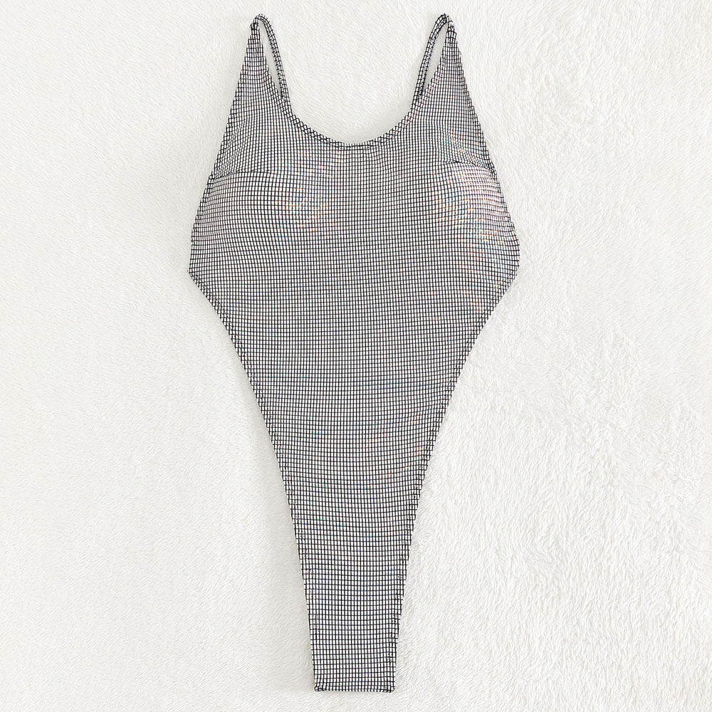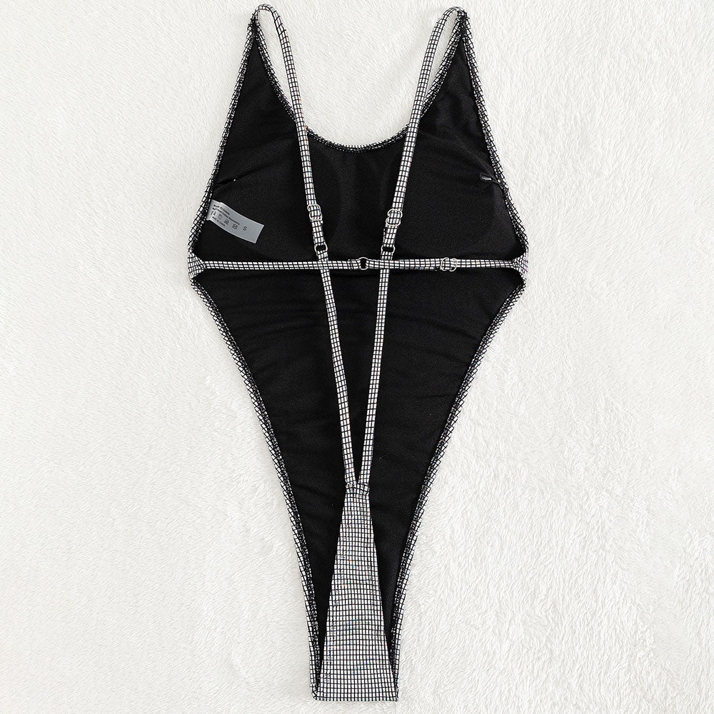 Sexy Metallic Gingham Low Back High Cut Thong Brazilian One Piece Swimsuit