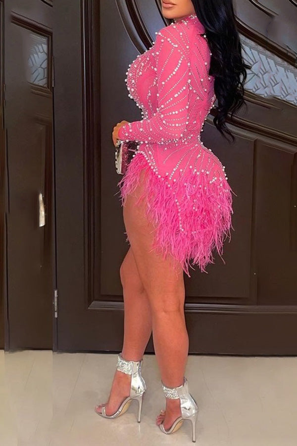 Sexy Sheer Beaded Slim Fit Stretch Asymmetric Feather Trim Mini Dress