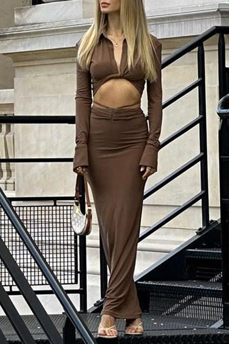 Sexy Solid Hollowed Out Fold Turndown Collar Long Sleeve Two Pieces