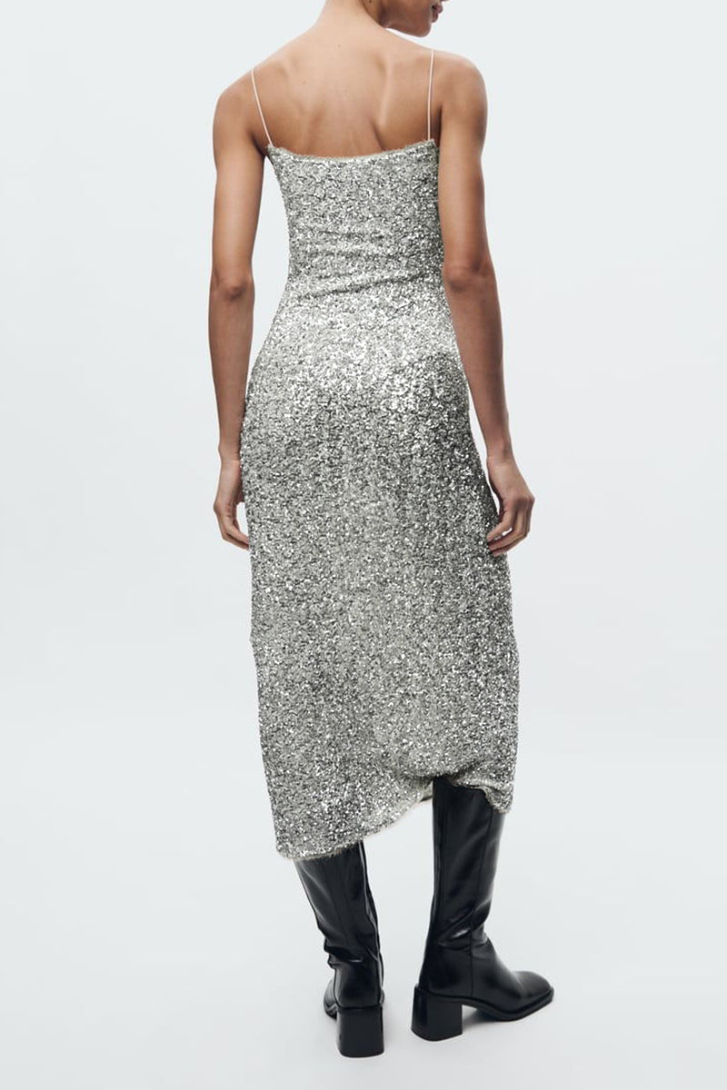Sexy Solid Sequins U Neck Wrapped Skirt Dresses