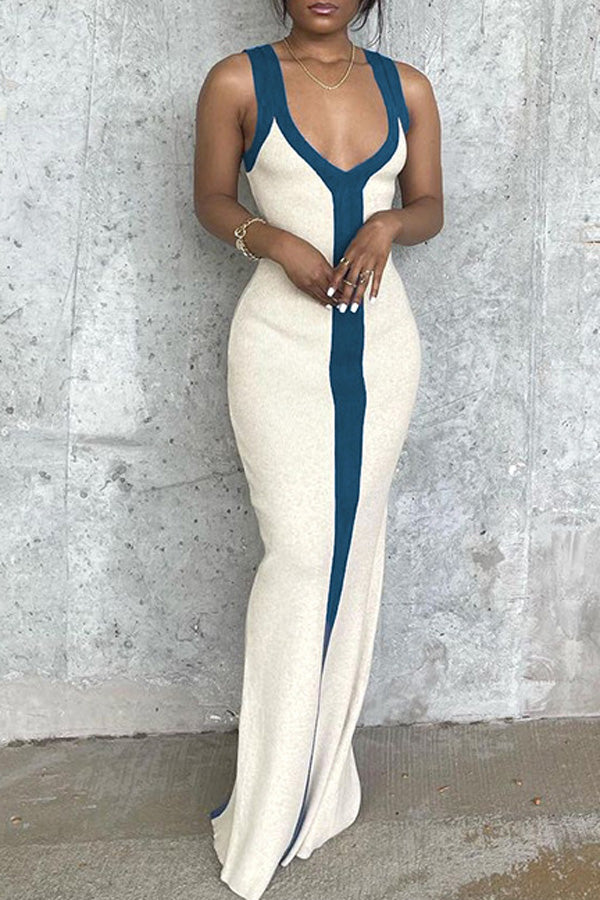 Sexy V-neck Wide Shoulder Straps Contrasting Color Slim Holiday Dress