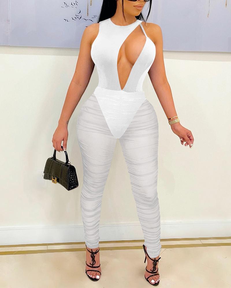 Sheer Mesh Cut Out Zip Back Asymmetrical Neck Casual Jumpsuit