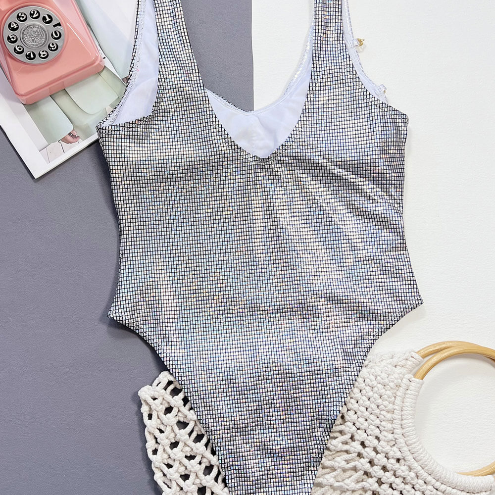 Shimmer Chain Link Contrast Gingham High Cut Brazilian One Piece Swimsuit