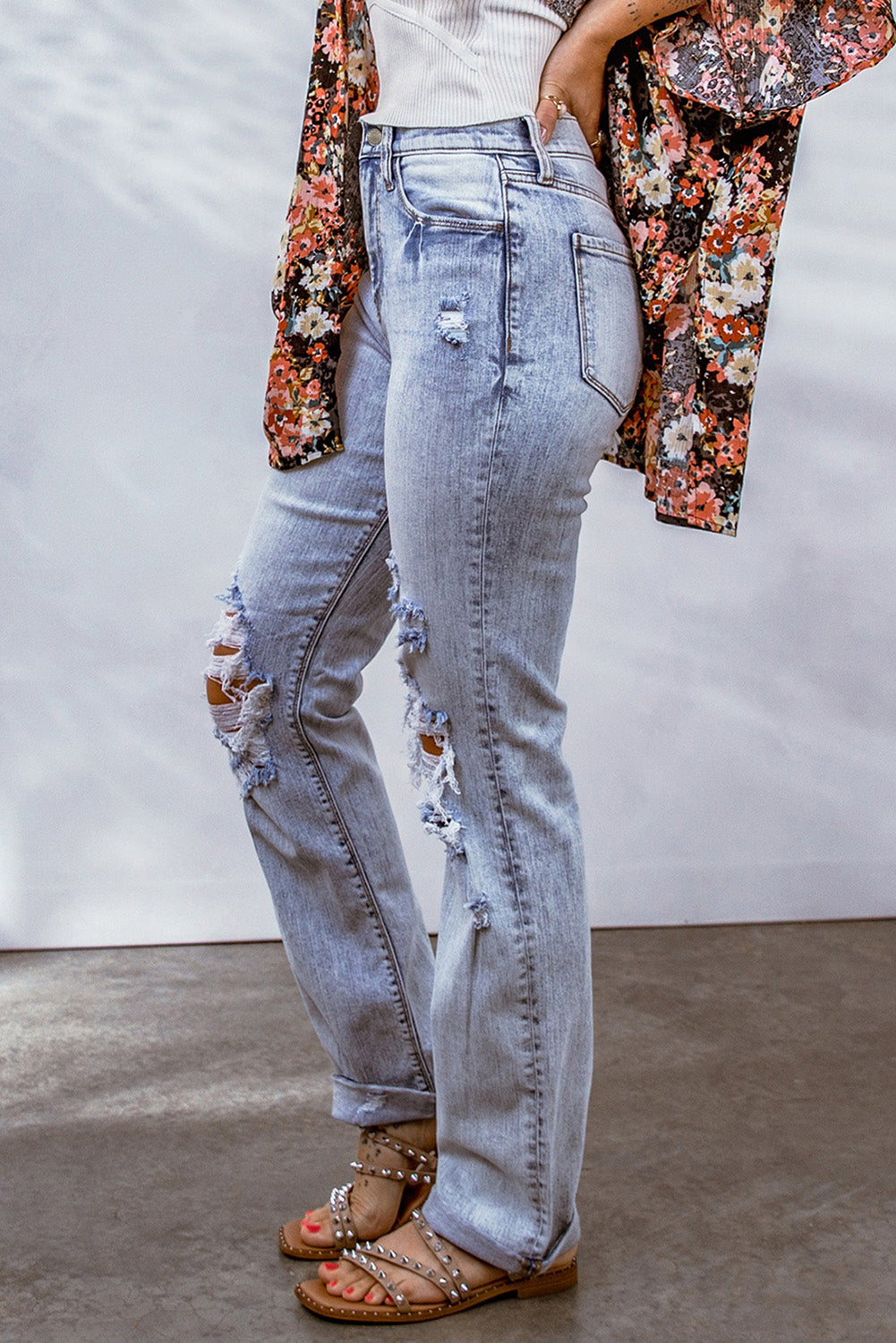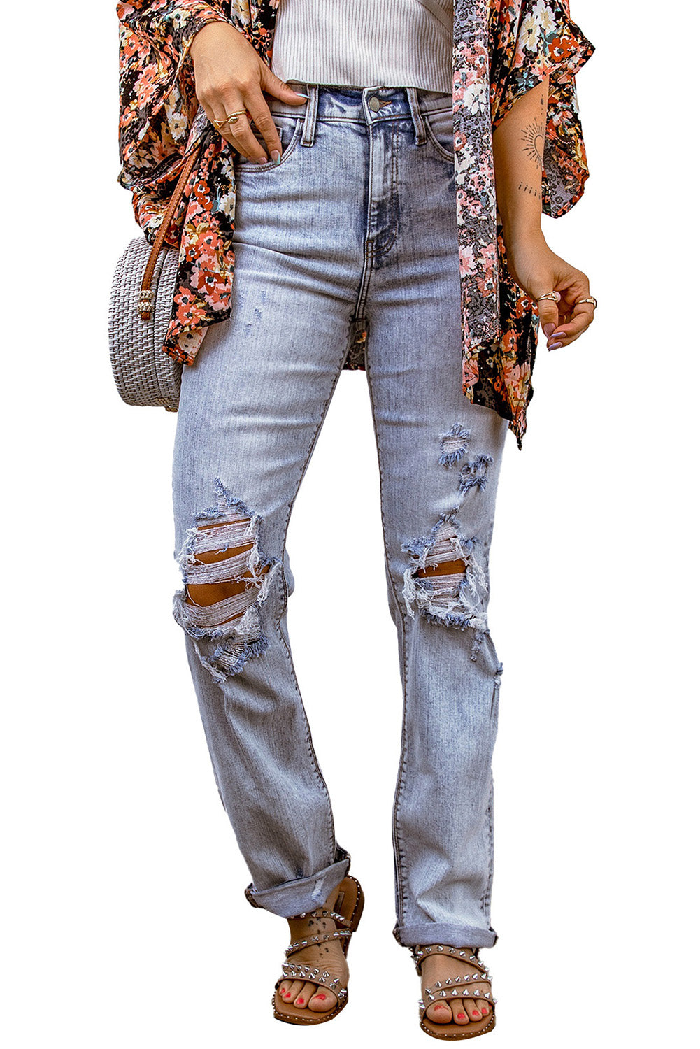 Sky Blue Acid Wash Sheath Straight Leg Distressed Jeans