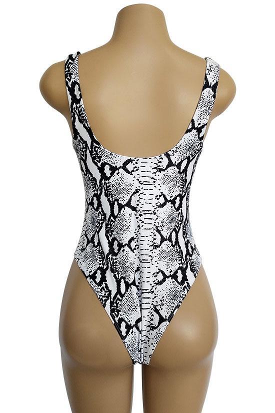 Wild one piece swimsuit featuring square neckline with padded cups, stretchy suspender shoulder straps, and brief-cut bikini bottom. Allover snake printed.