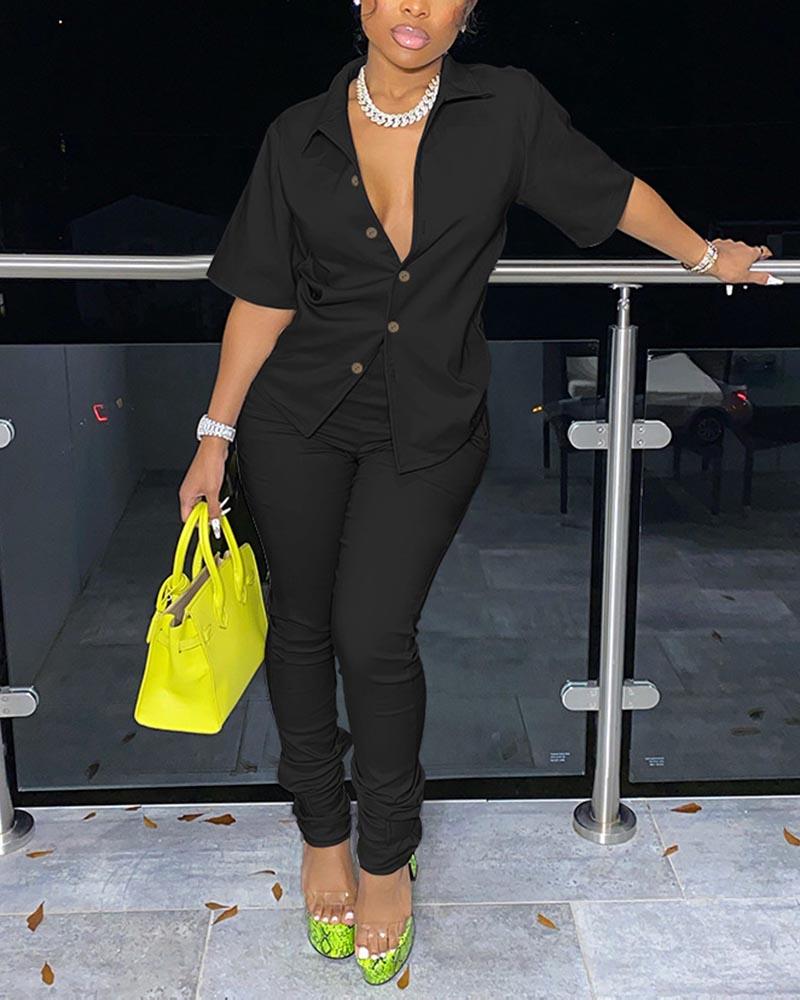 Solid Button Front Short Sleeve Top & Pants Set