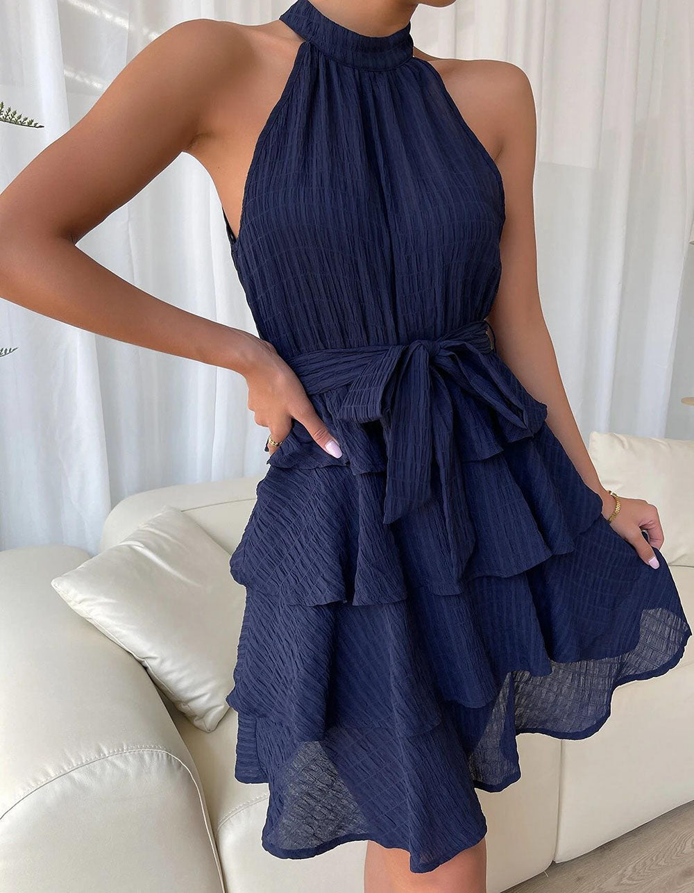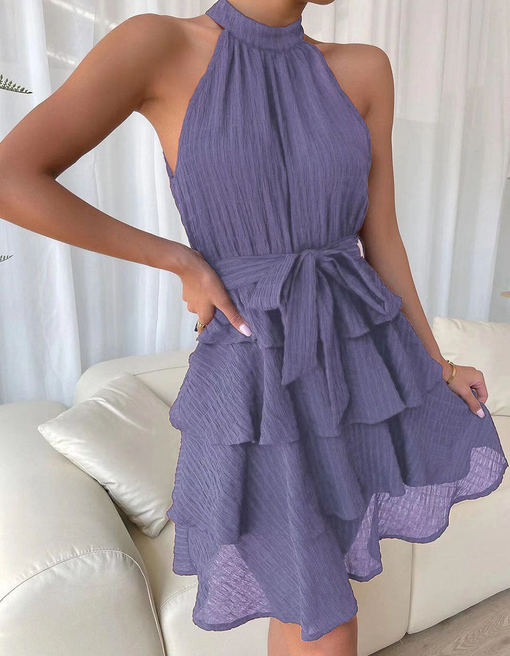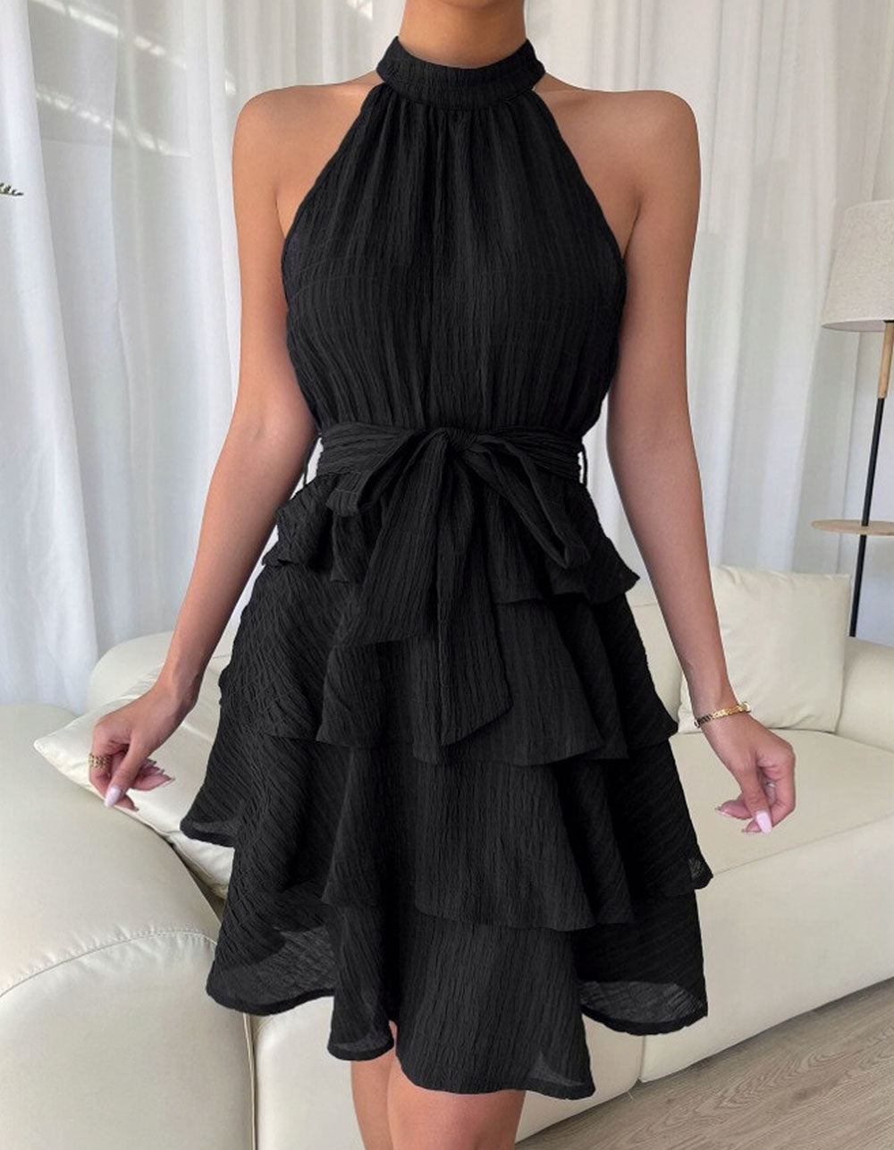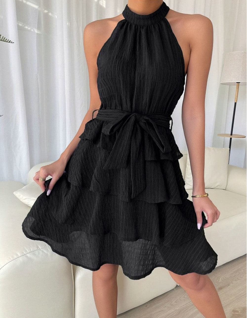 Solid-color Belted Stitching Sleeveless Ruffle Hem Short A-Line Dresses