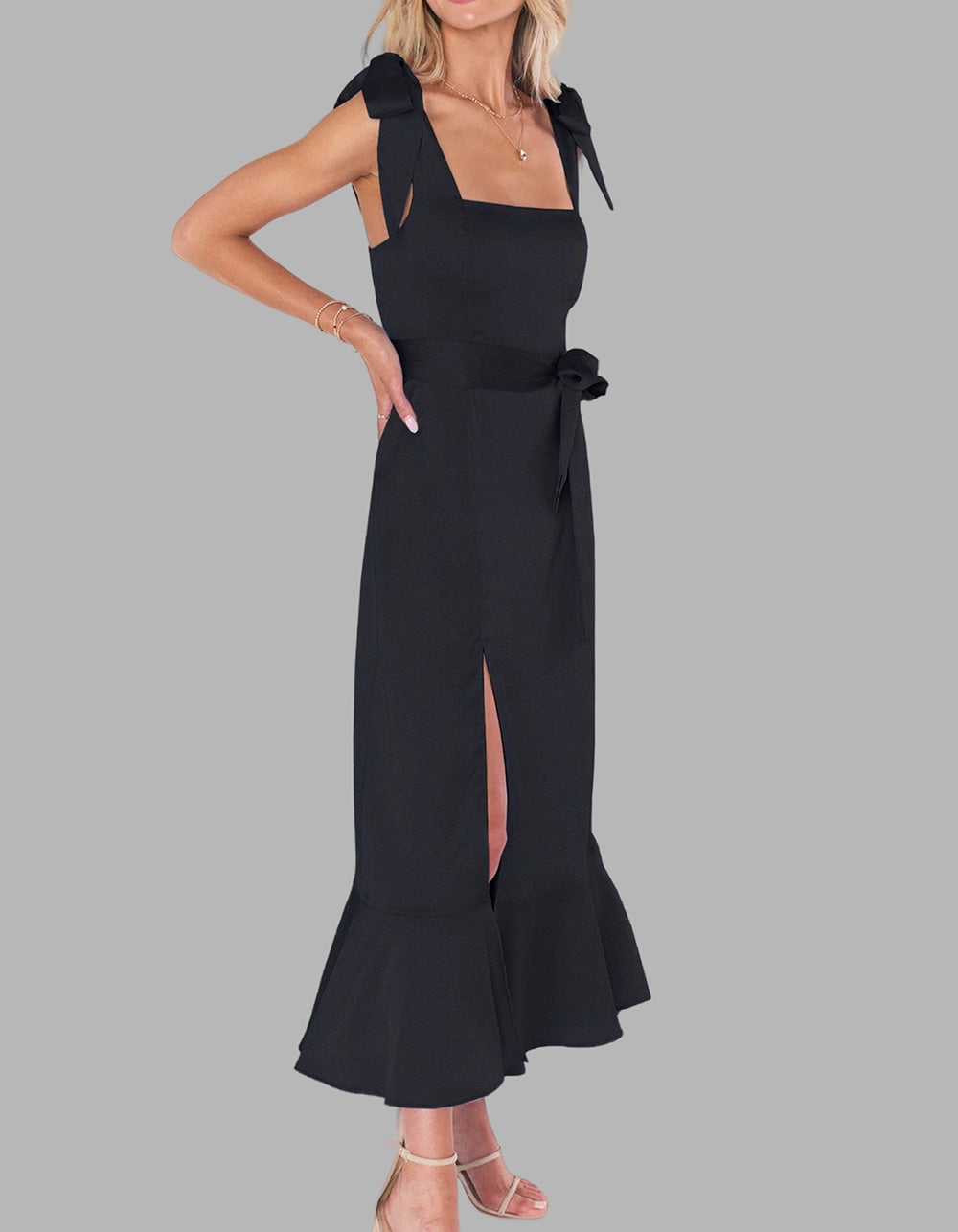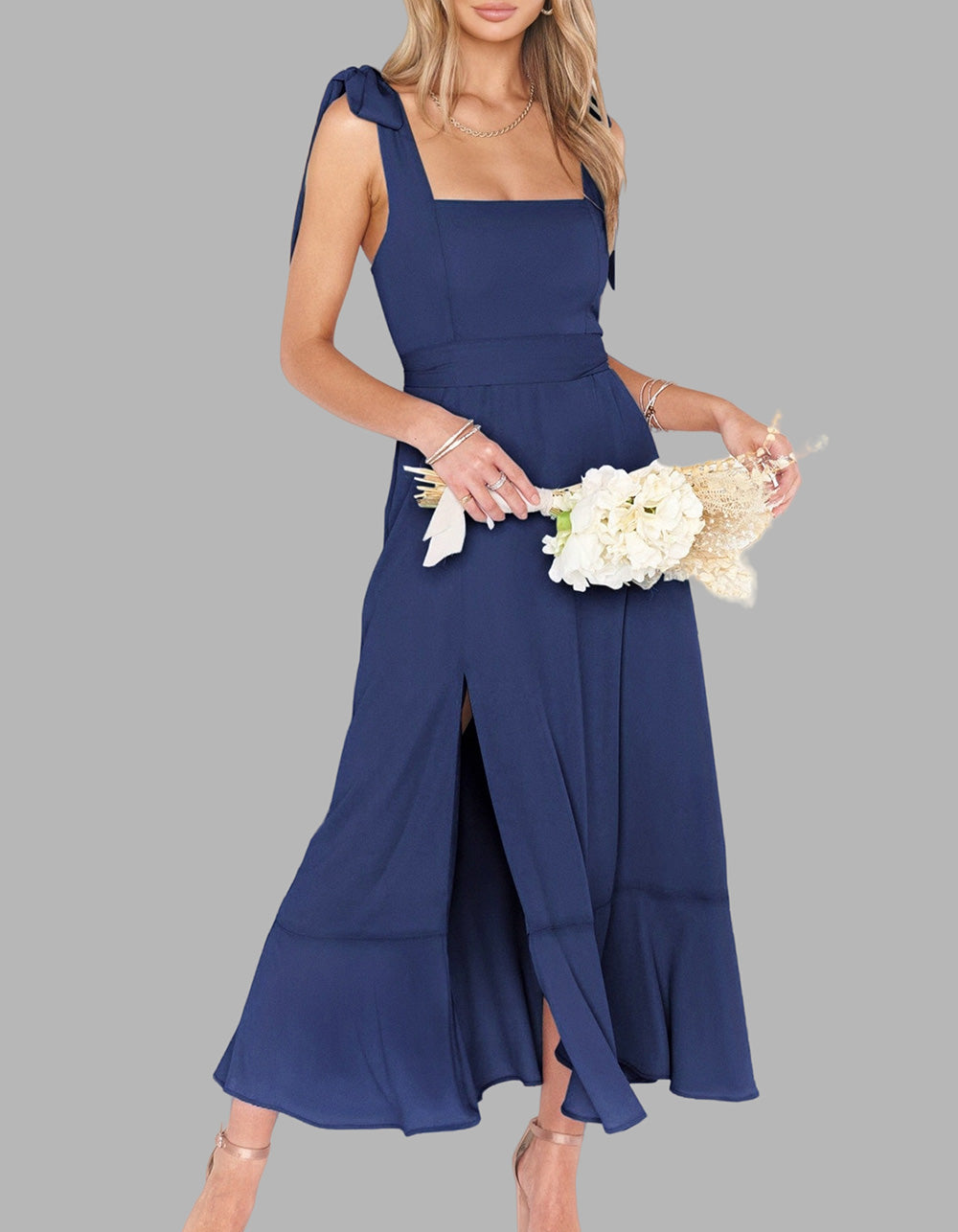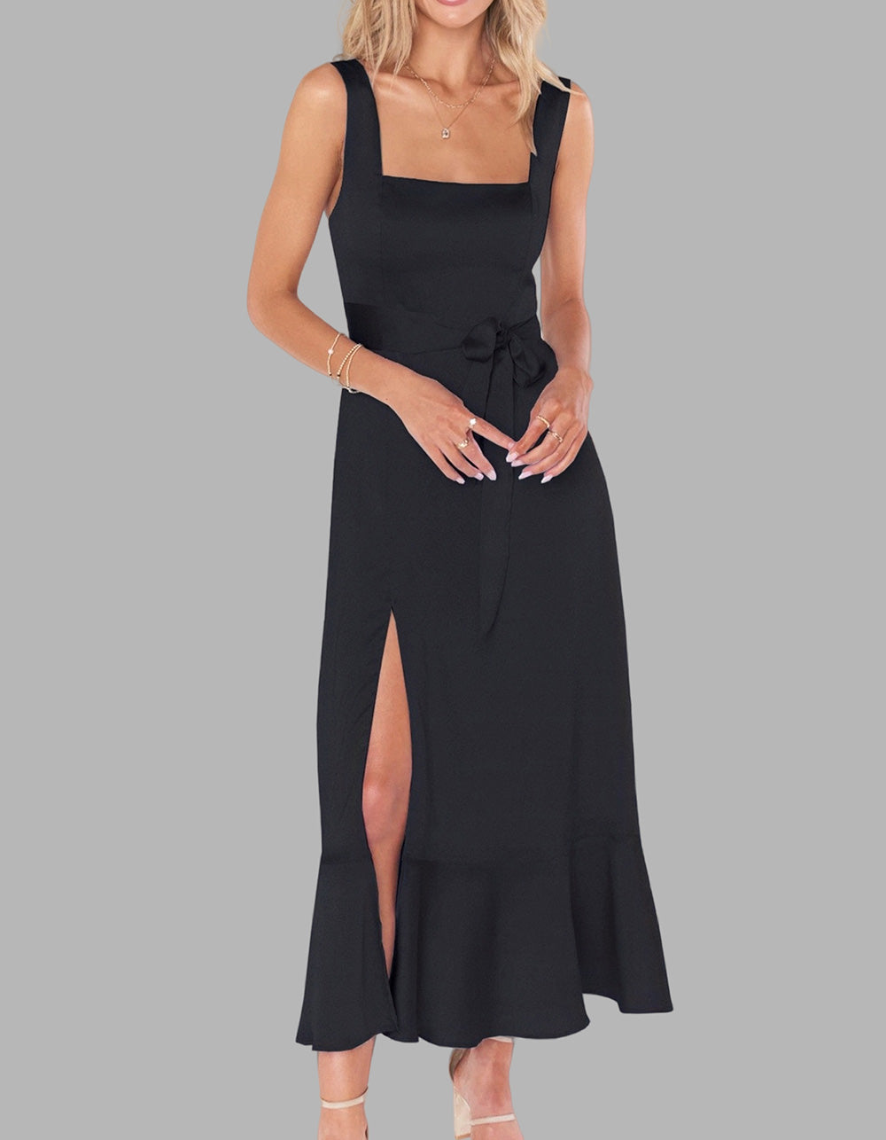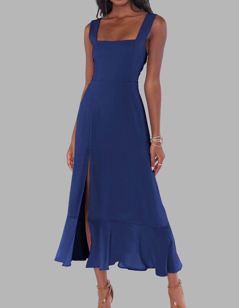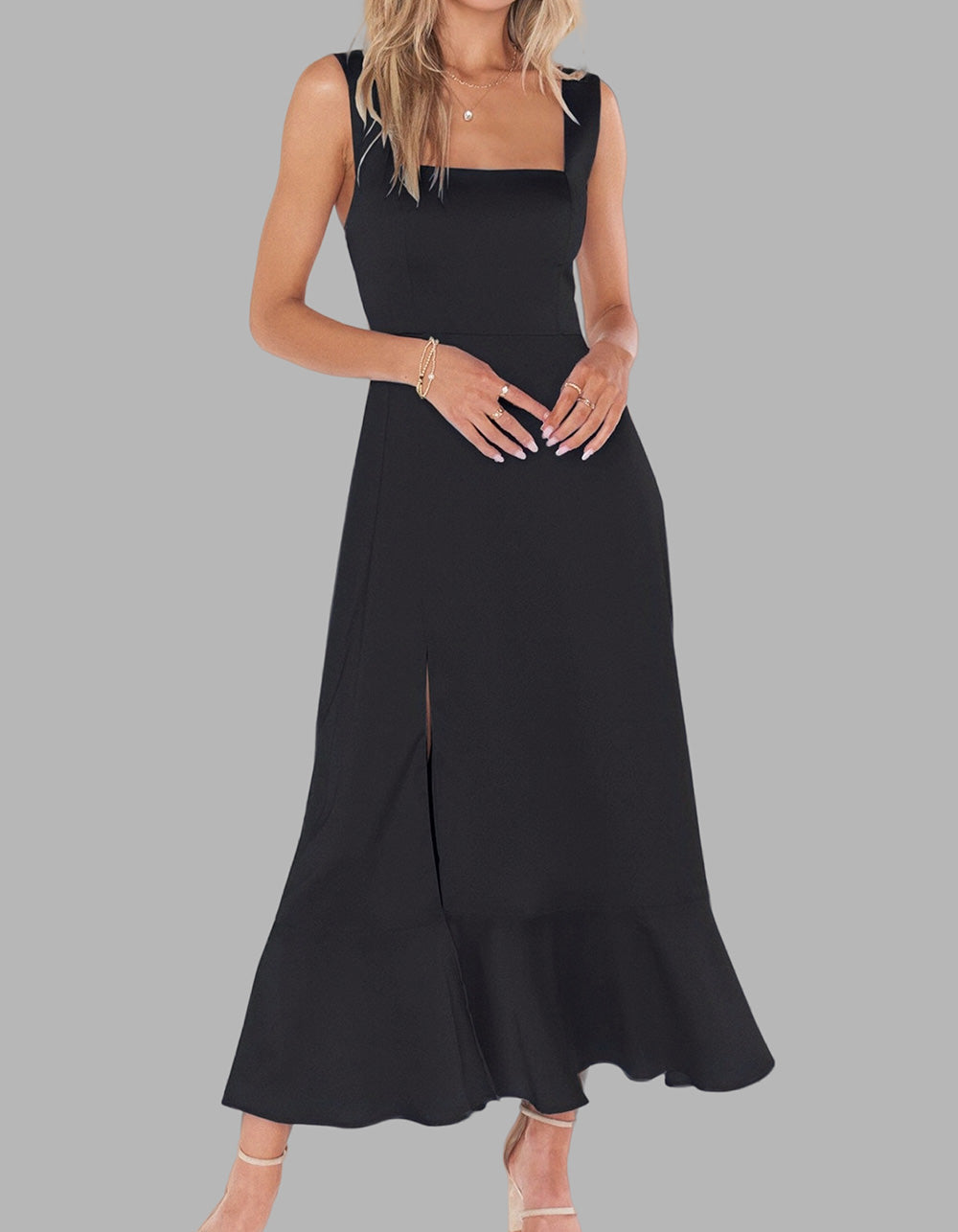 This Solid-color Elegant Square Neck Backless Slits Long A-Line Dress is perfect for any occasion. Crafted with high-quality polyester for a fit that flatters, it features an A-line design with a square neckline, sleeveless silhouette, and slit detail. Available in five colors, you're sure to find a shade that reflects your personal style.