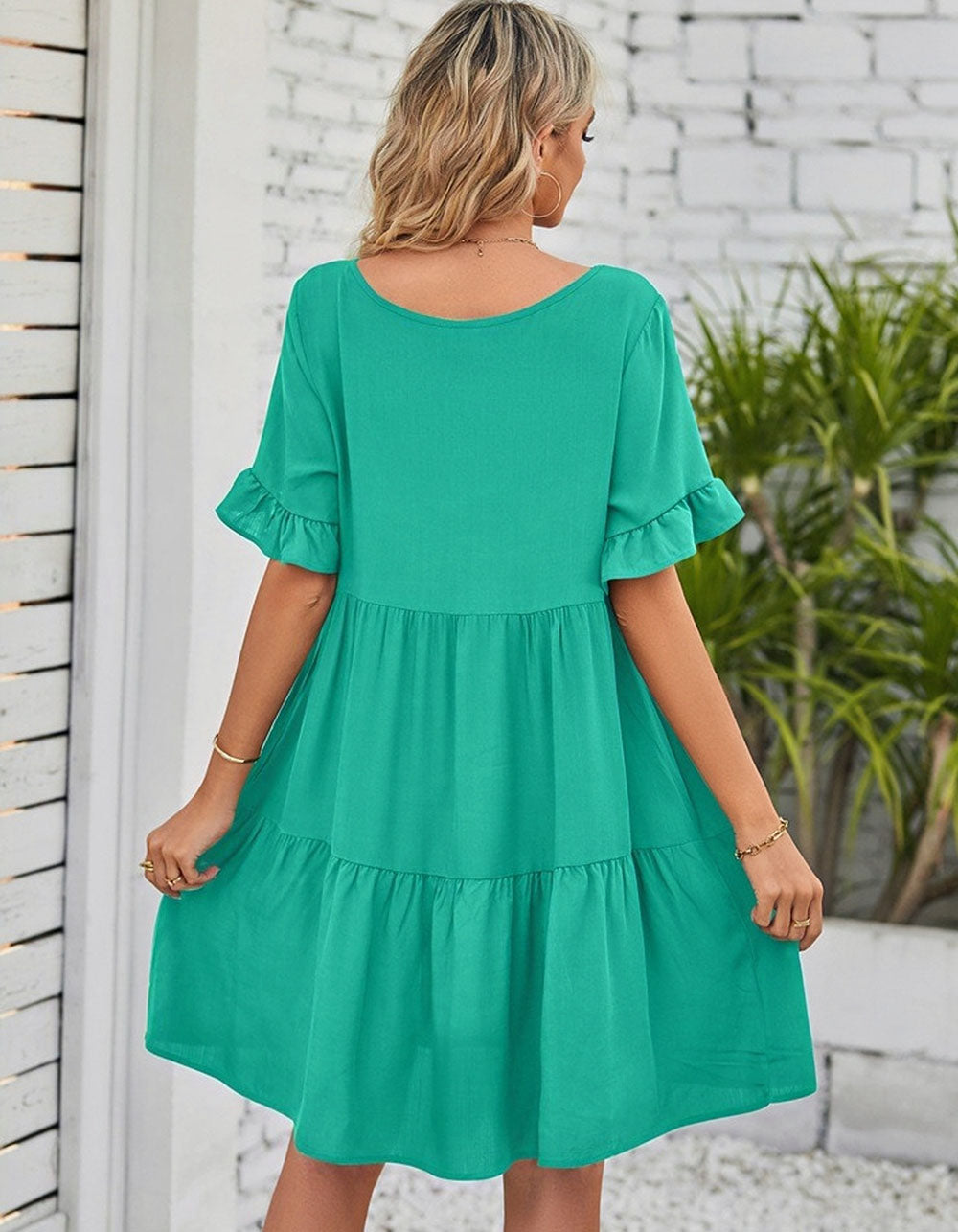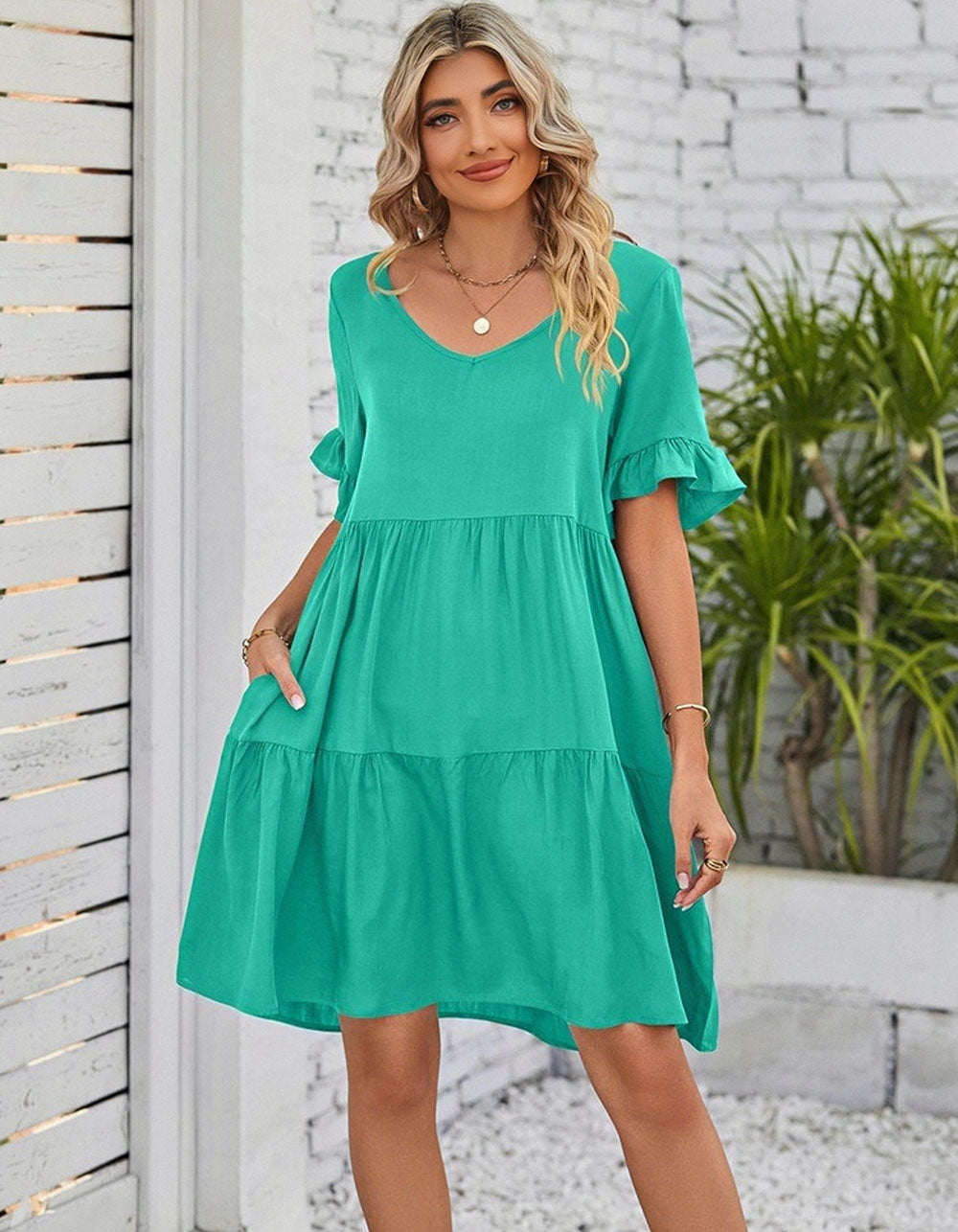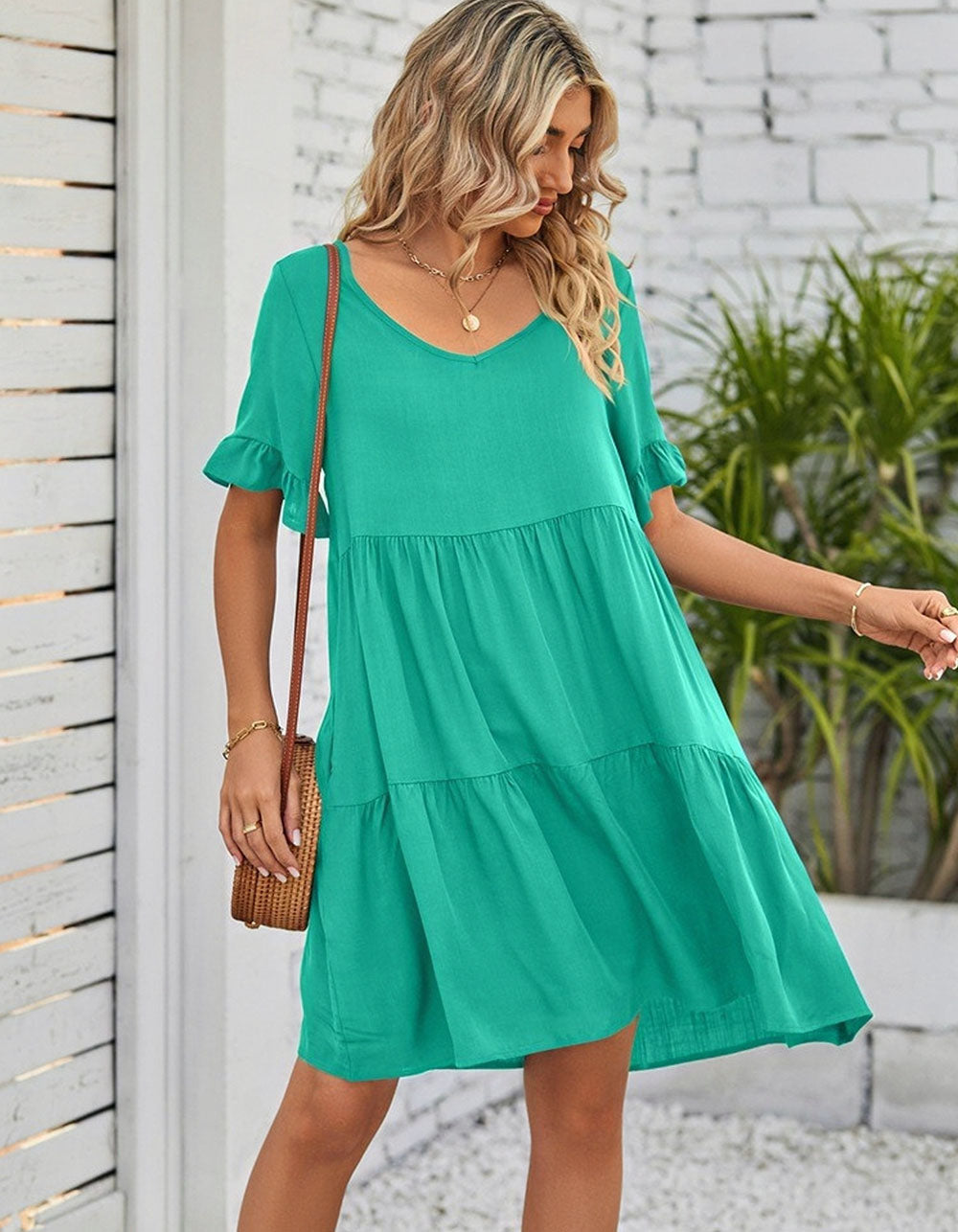 This Solid-color Plain V Neck Short Sleeve Midi A-Line Dress is perfect for any occasion. It is made from a soft cotton fabric with a slight stretch, and features a V-neckline, short sleeves, a loose waistline, and a midi length. The elegant A-line silhouette is styled with ruffle details for a beautiful touch, and is available in black, white, and green.