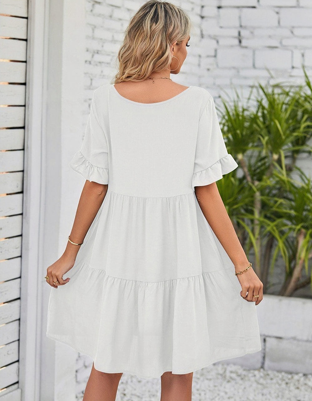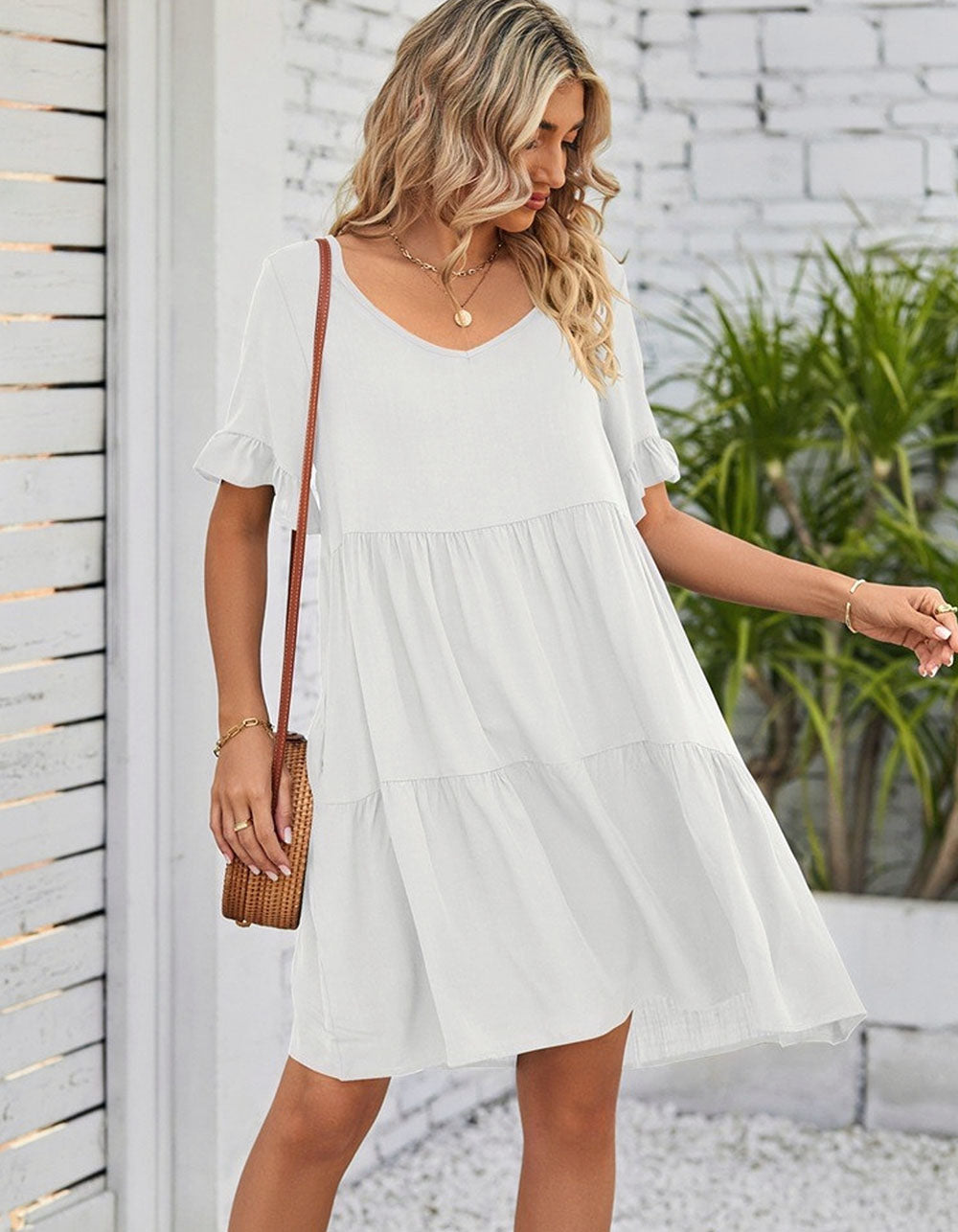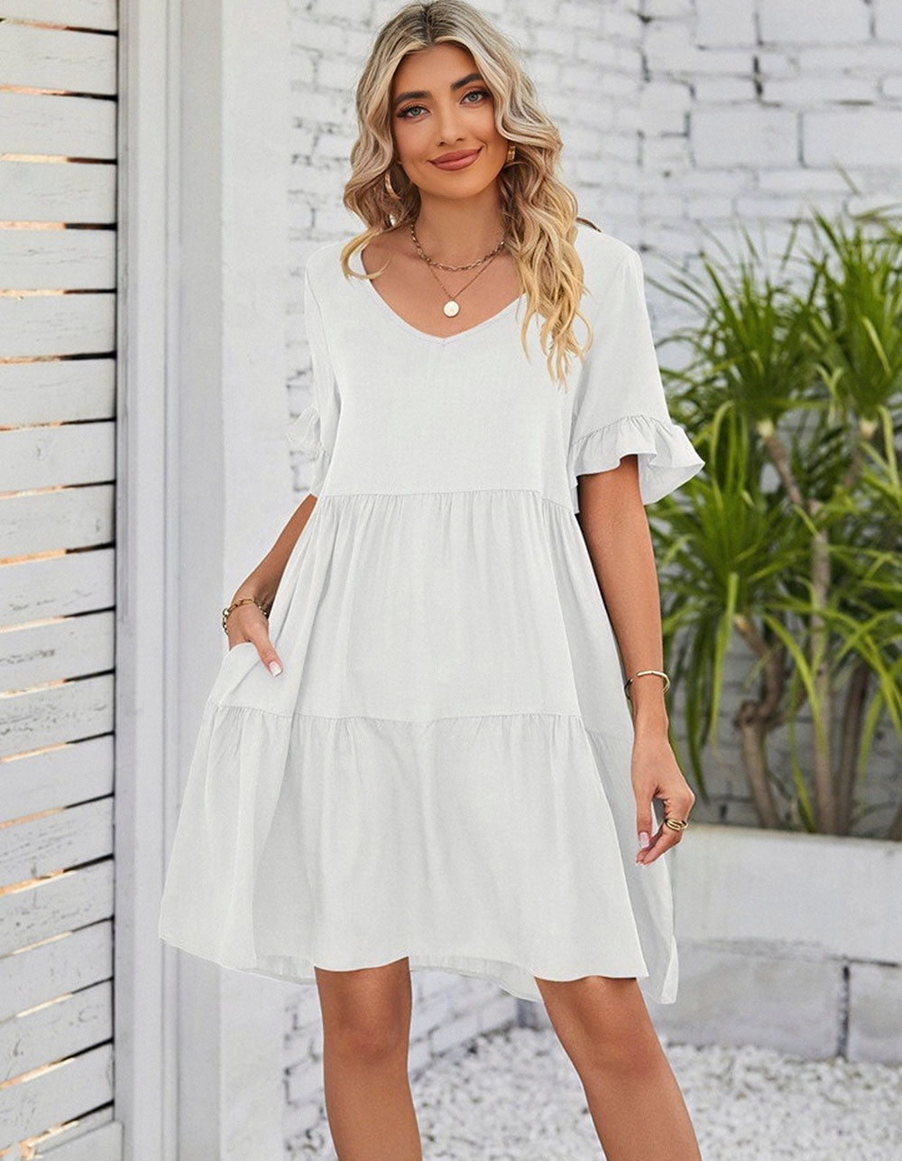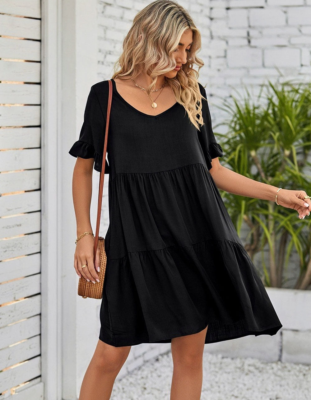 This Solid-color Plain V Neck Short Sleeve Midi A-Line Dress is perfect for any occasion. It is made from a soft cotton fabric with a slight stretch, and features a V-neckline, short sleeves, a loose waistline, and a midi length. The elegant A-line silhouette is styled with ruffle details for a beautiful touch, and is available in black, white, and green.