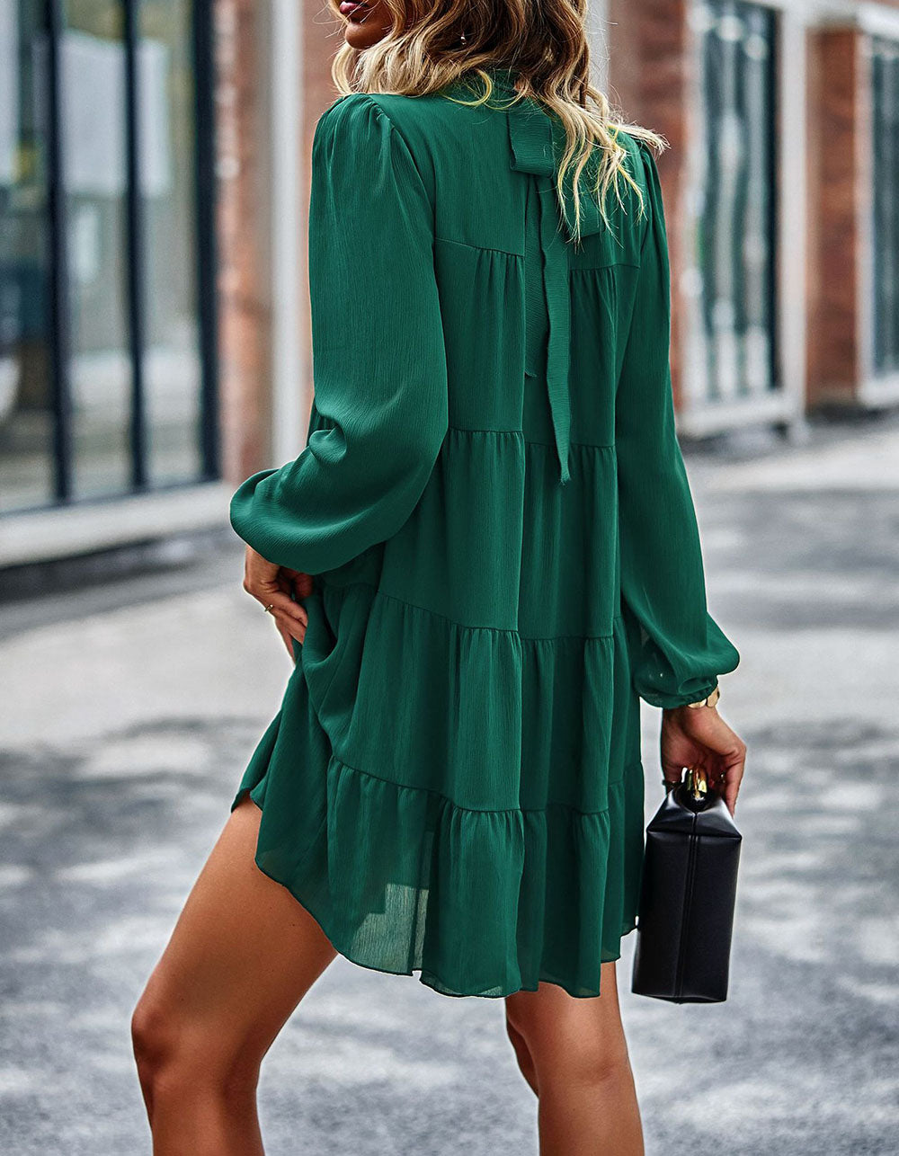 Solid-color Round Neck Long Sleeve Loose Short A-Line Ruffle Hem Dresses