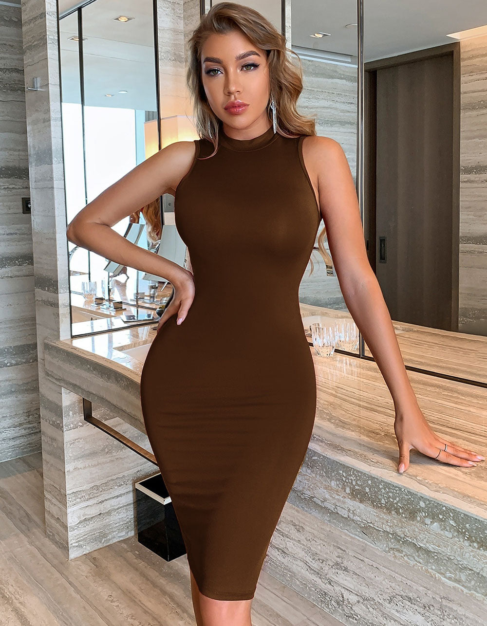 Look elegant and feel comfortable in this solid-color Round Neck Sleeveless Ruched Midi Bodycon Dress. Features polyester and cotton fabric blend with a mid waist design and pencil-shaped hem. Available in black and brown colors. Perfect for casual, office or formal occasions.