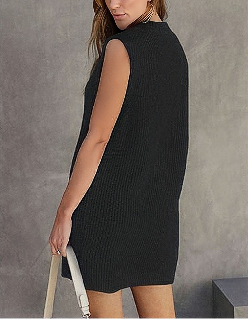 Solid-color Round Neck Sleeveless Slits Short Knitted A-Line Dresses