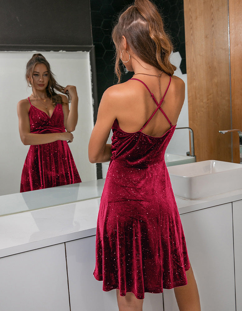 Solid-color Strap Backless Gold Velvet Dinner Dresses