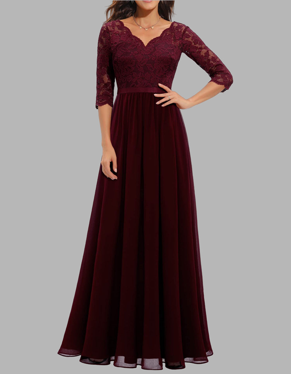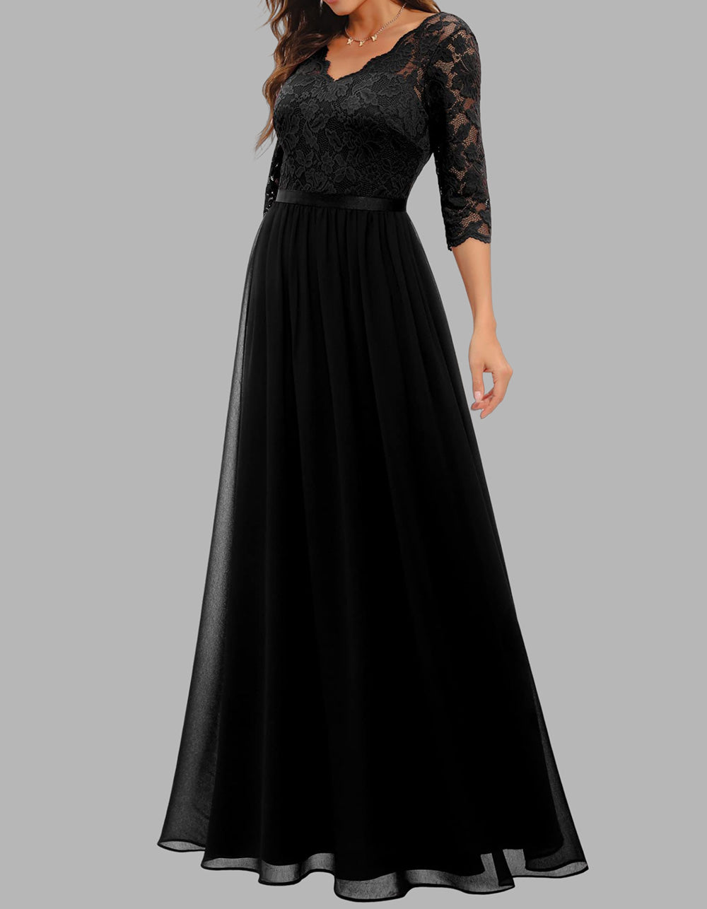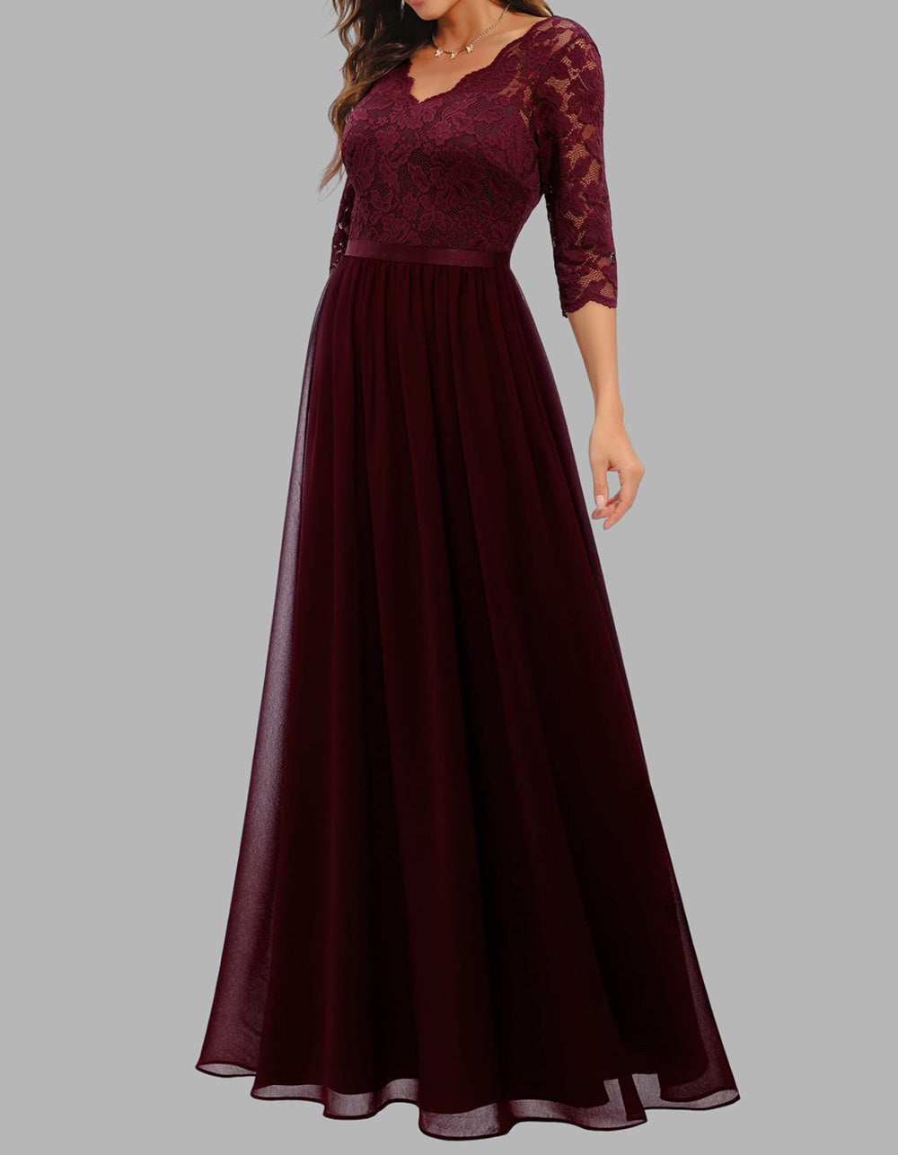 Solid-color V Neck Lace Patchwork Long A-Line Ruffle Hem Evening Dresses