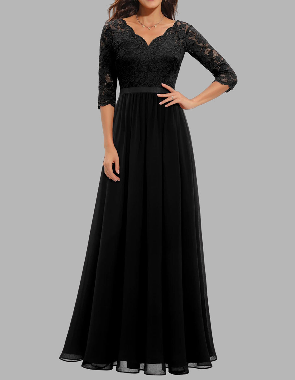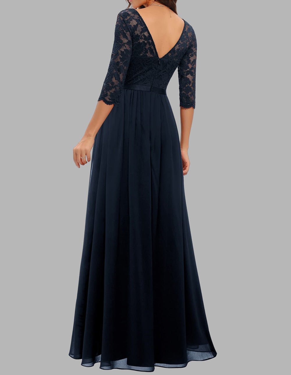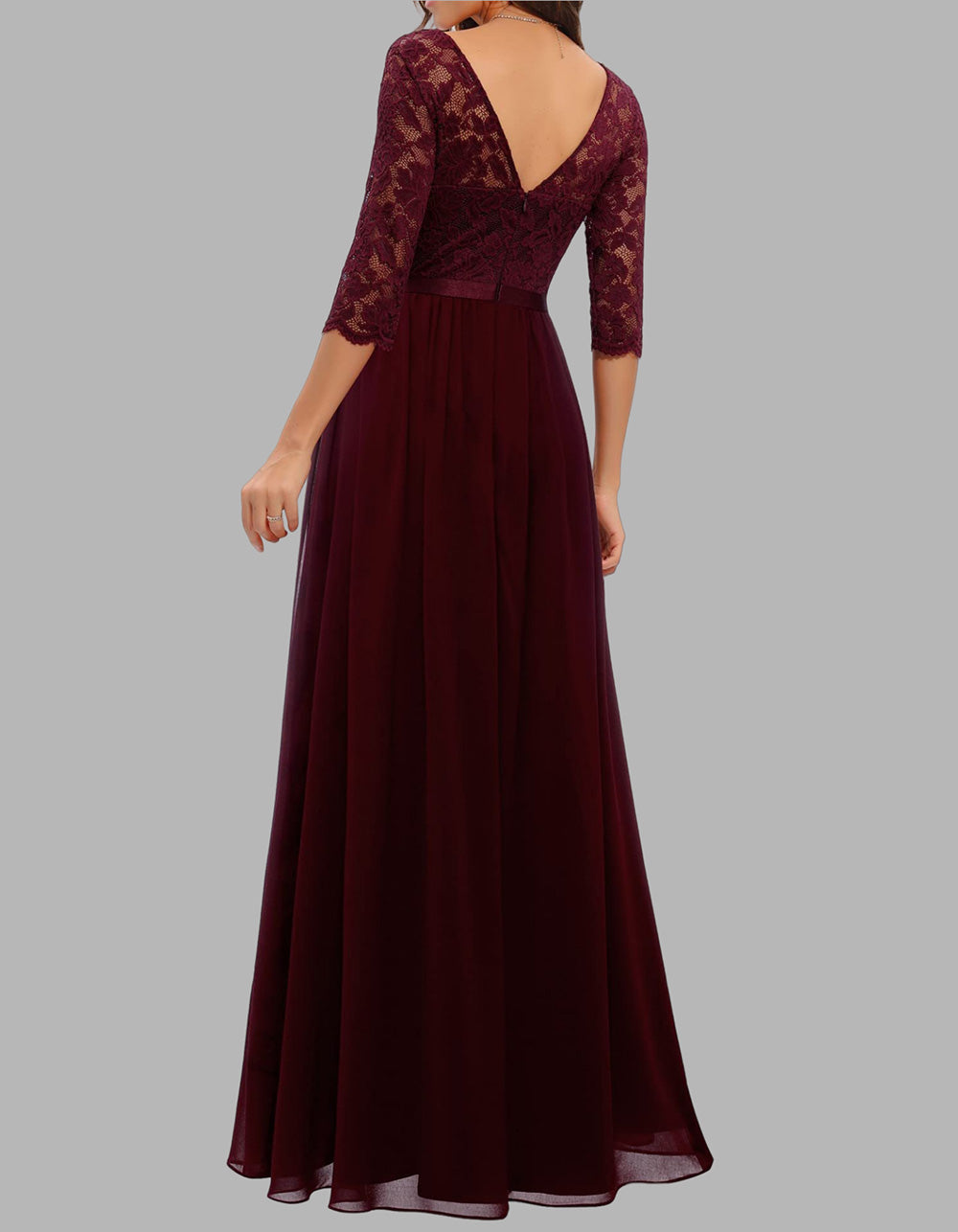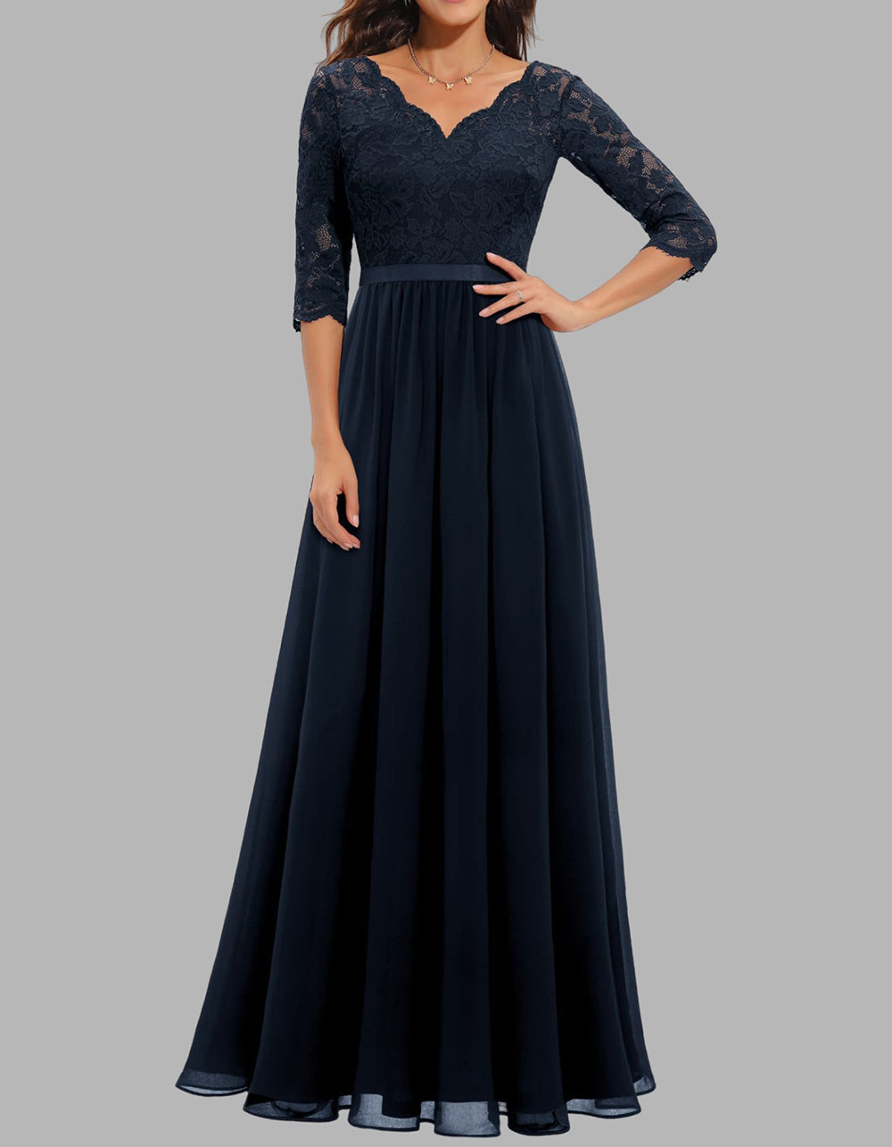 Solid-color V Neck Lace Patchwork Long A-Line Ruffle Hem Evening Dresses