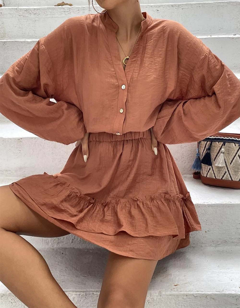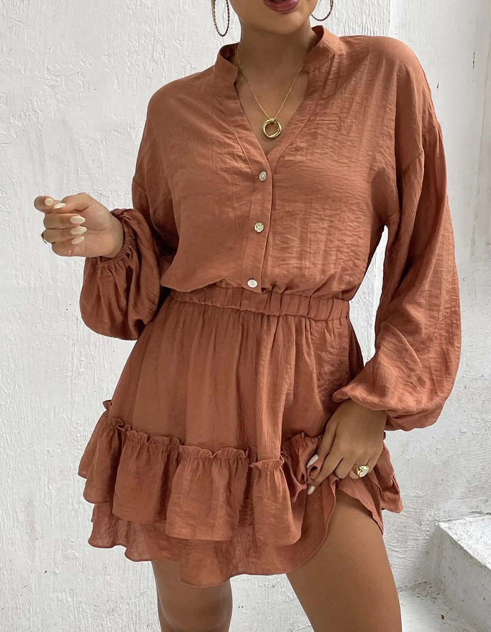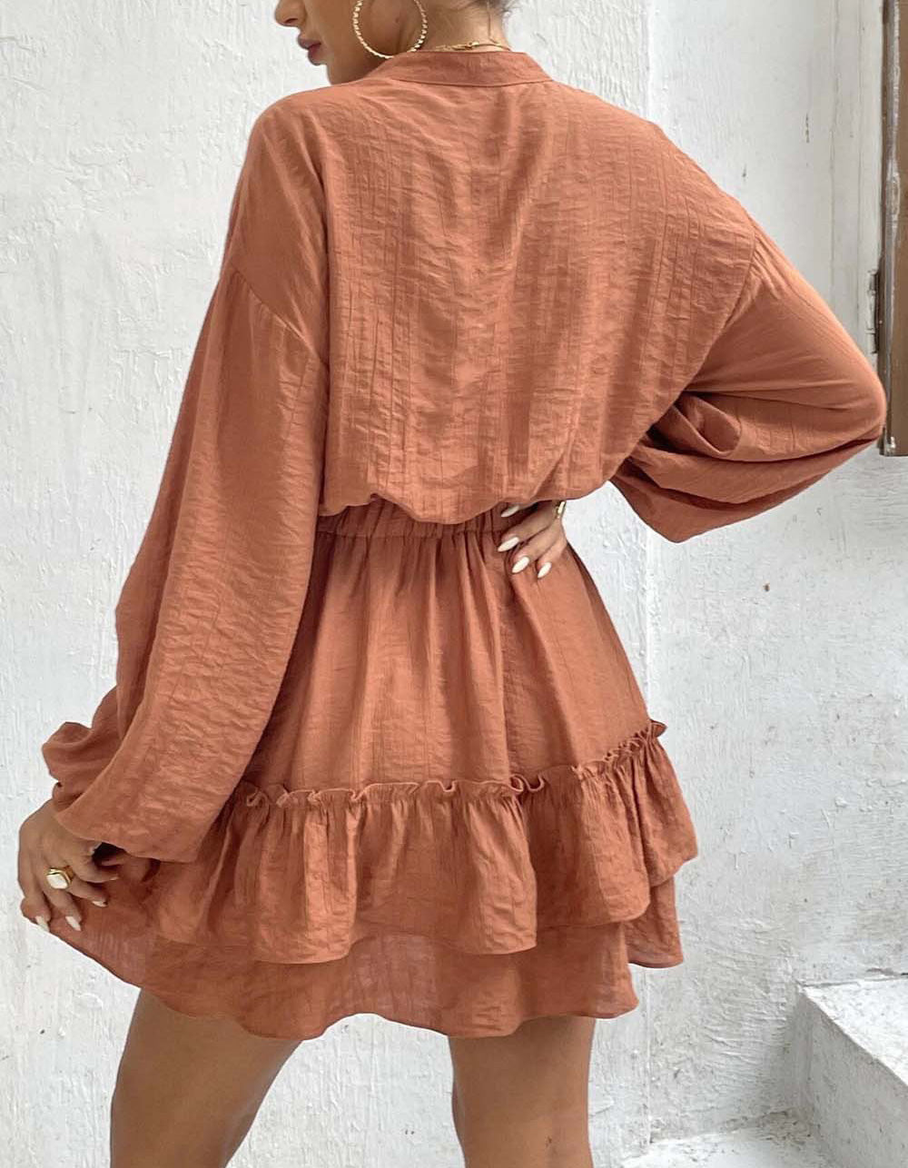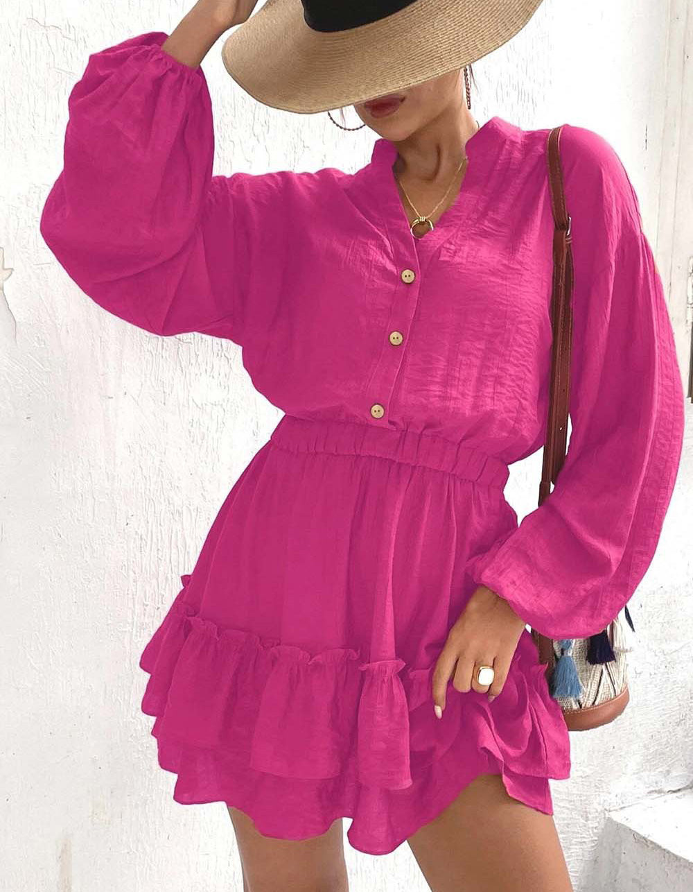 Solid-color V Neck Long Sleeve Ruffle Short A-Line Dresses