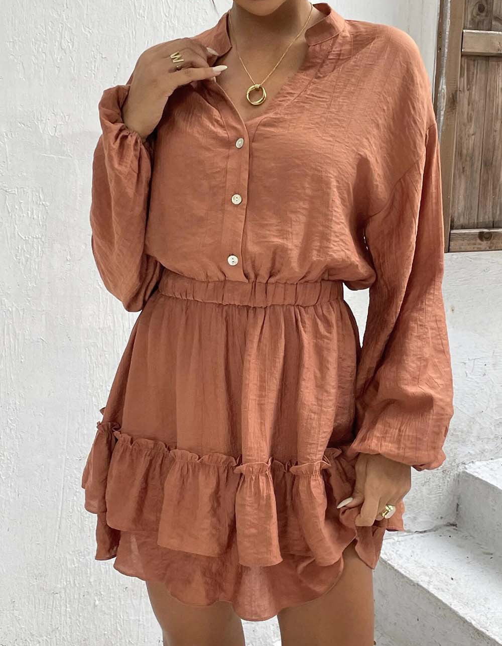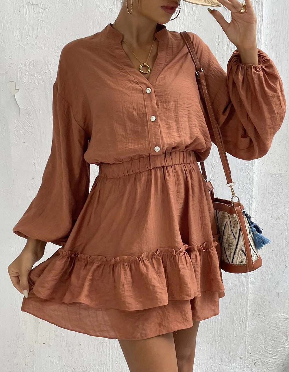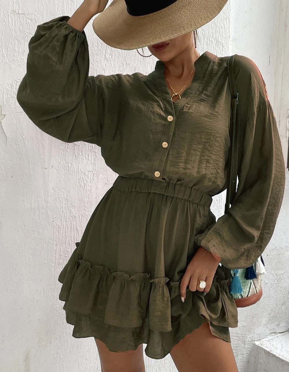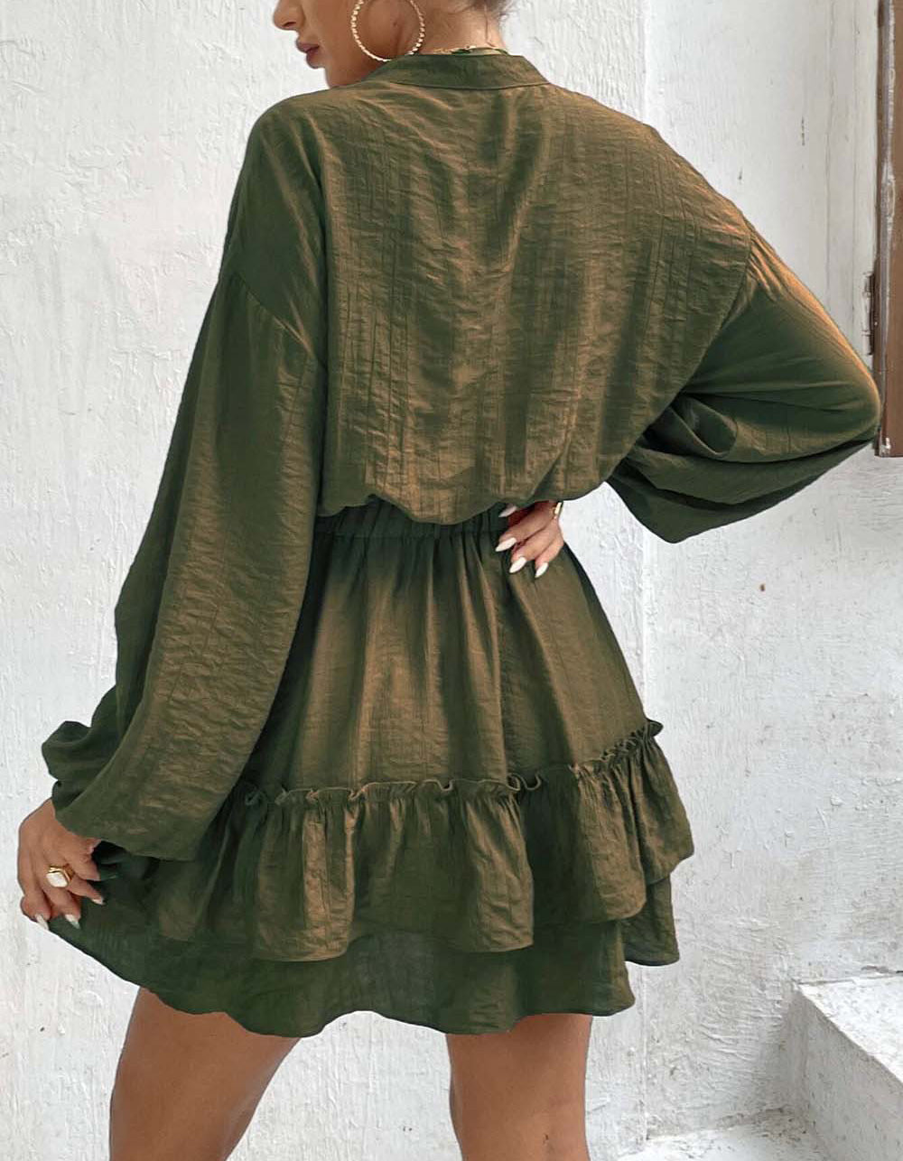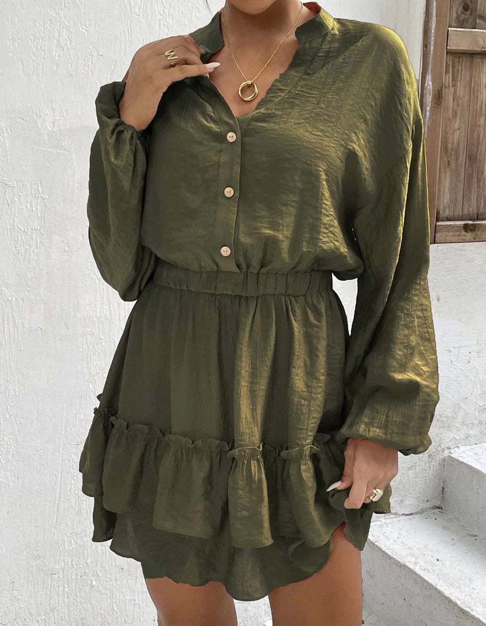This Solid-color V Neck Long Sleeve Ruffle Short A-Line Dress from the Cute, Elegant, Casual collection offers a refined, timeless look. Crafted from lightweight polyester with a slight stretch, this dress is designed with a V-neckline, button details, and a mid-waist silhouette for a modern touch. The subtle ruffle hem adds a graceful finishing touch for a look that’s perfect for any occasion. Available in red, green, and khaki.