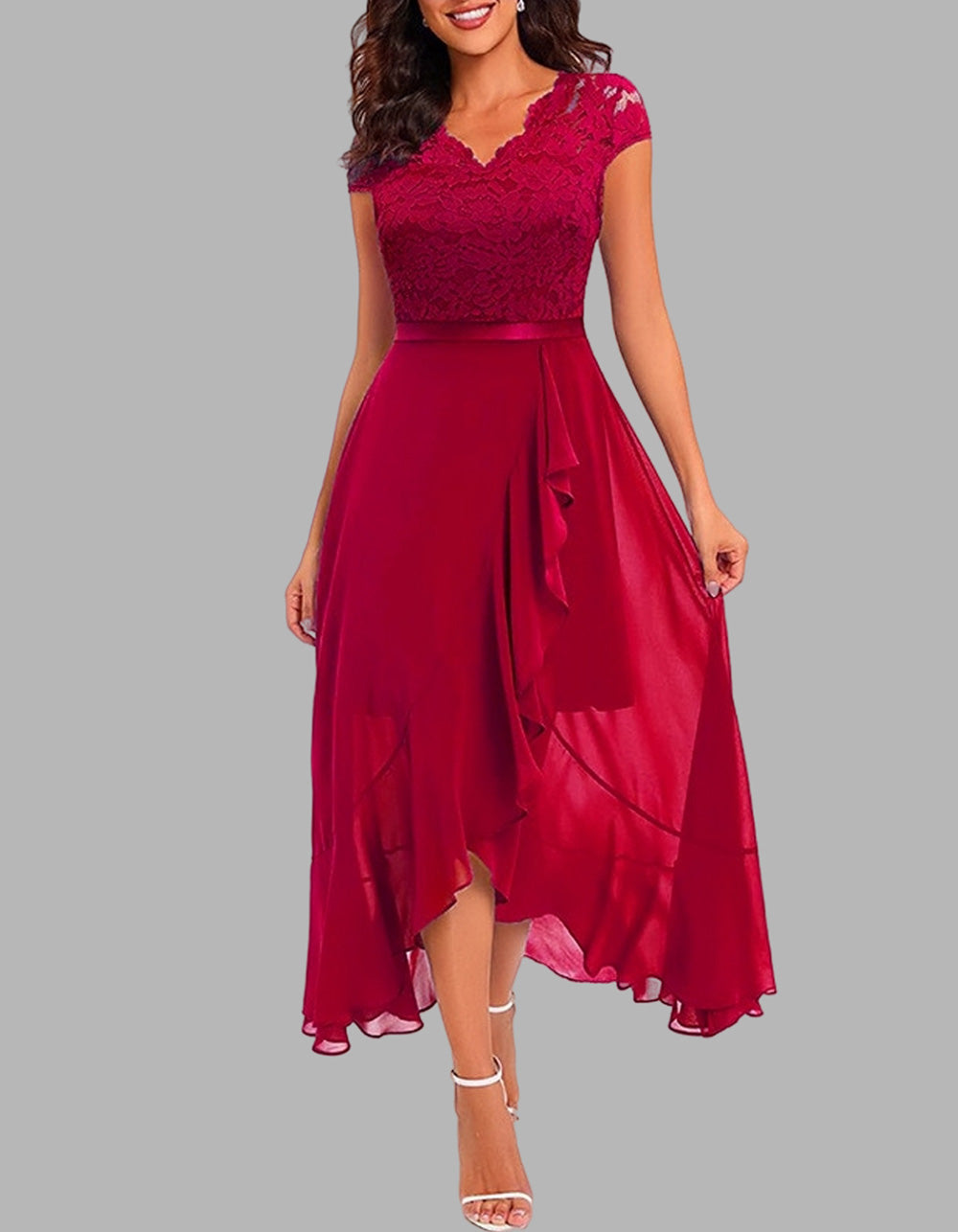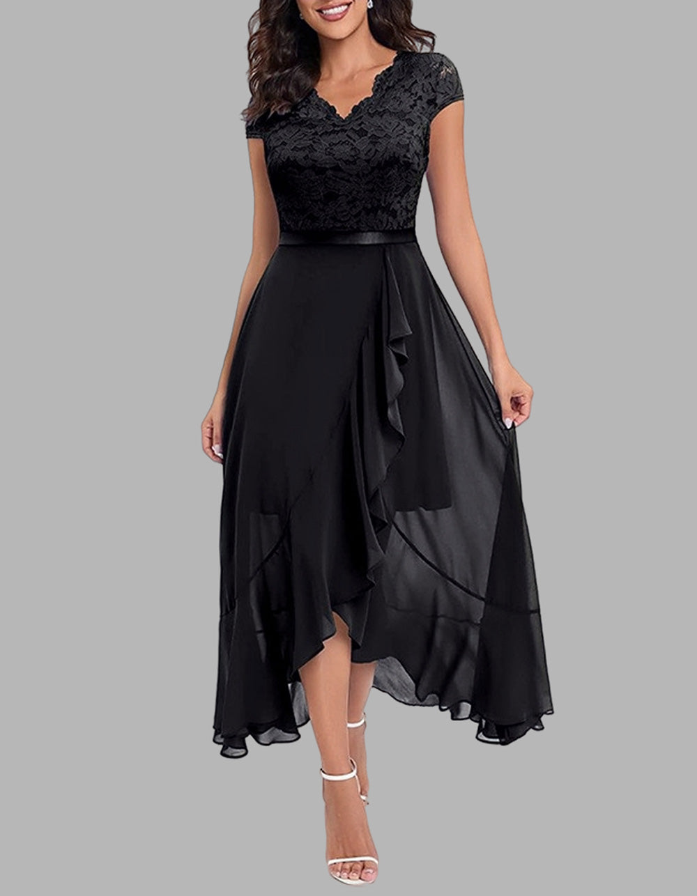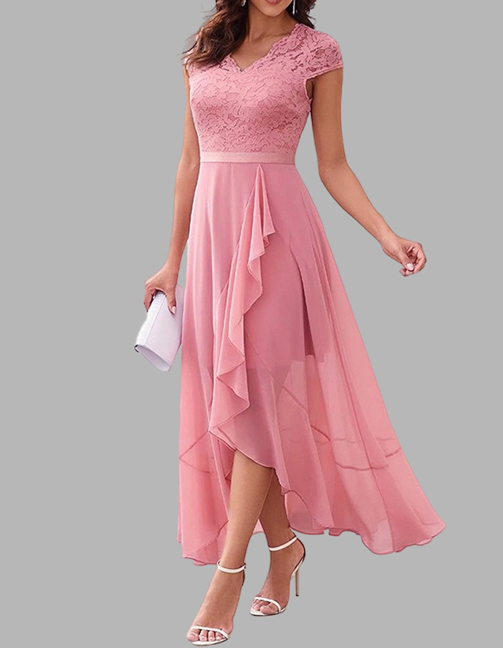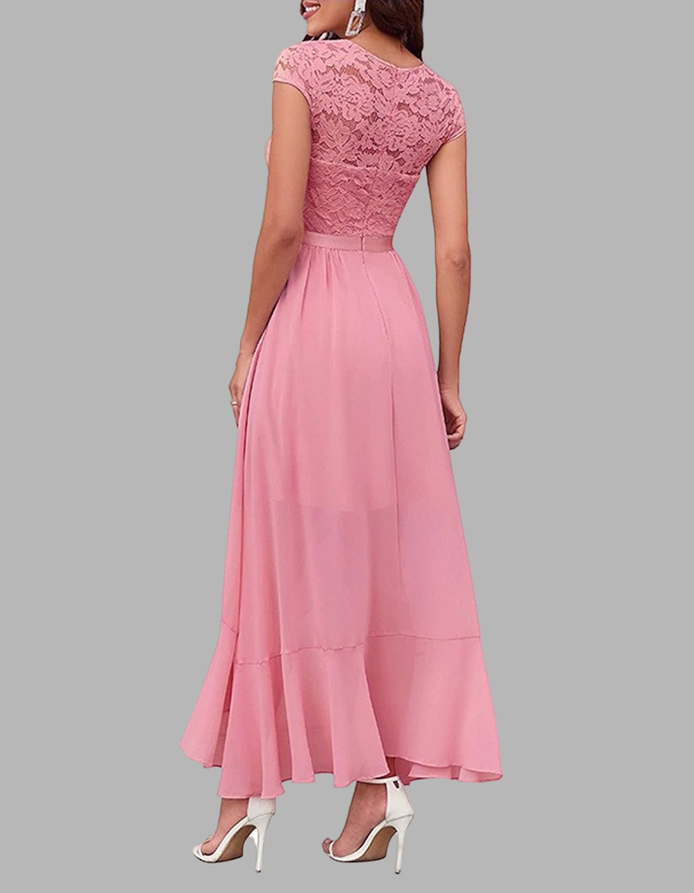 Solid-color V Neck Short Sleeve Lace High Waist Asymmetrical Long A-Line Dresses