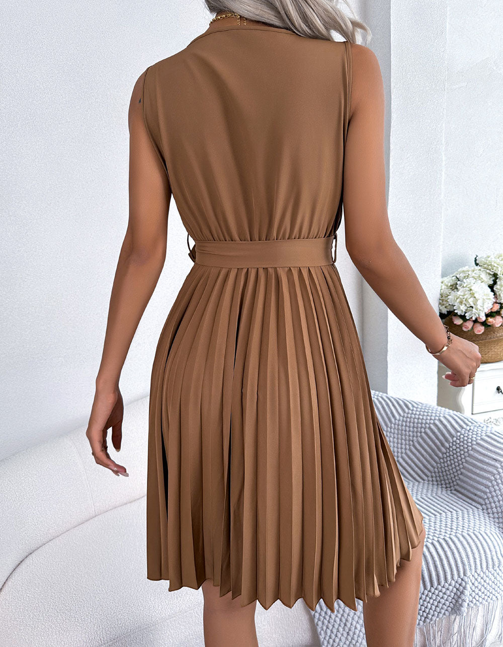 Solid-color V Neck Sleeveless Pleated Short A-Line Dresses