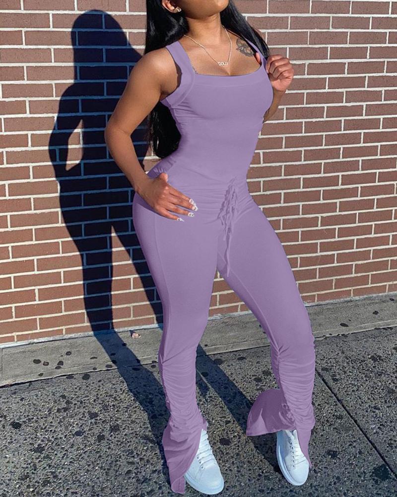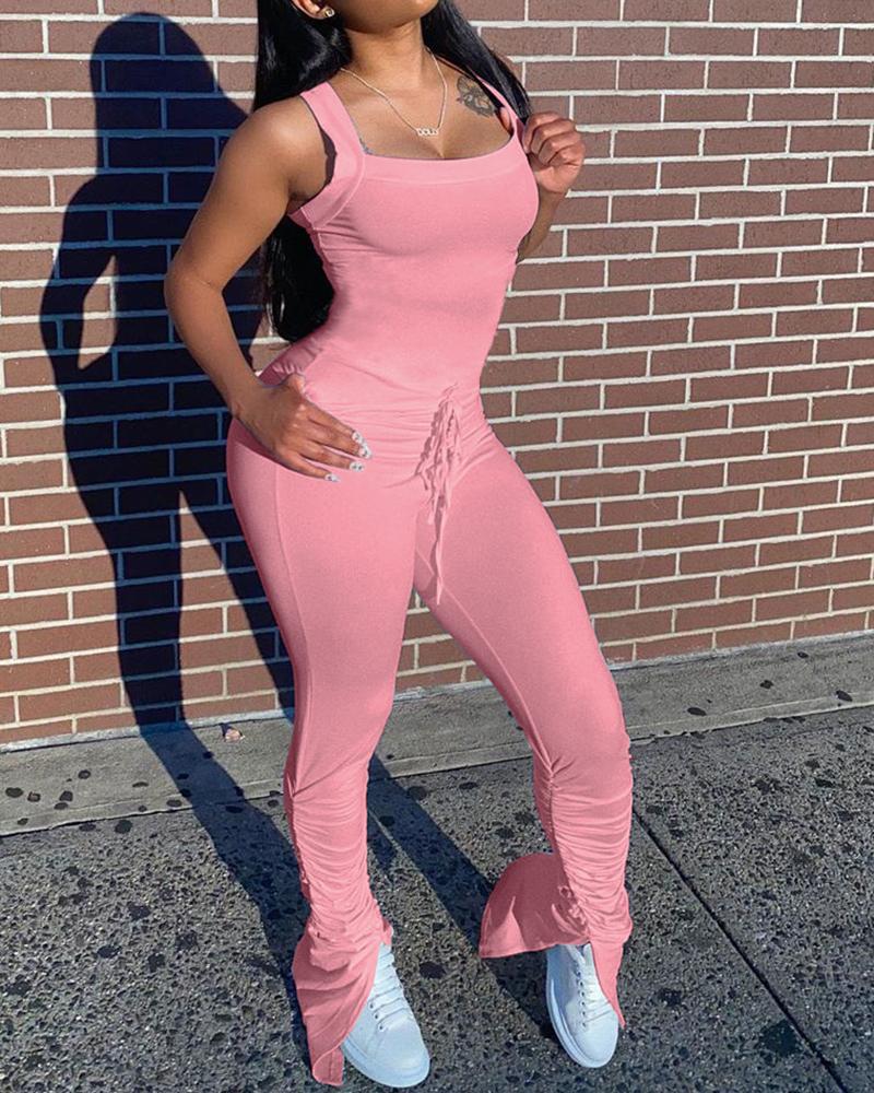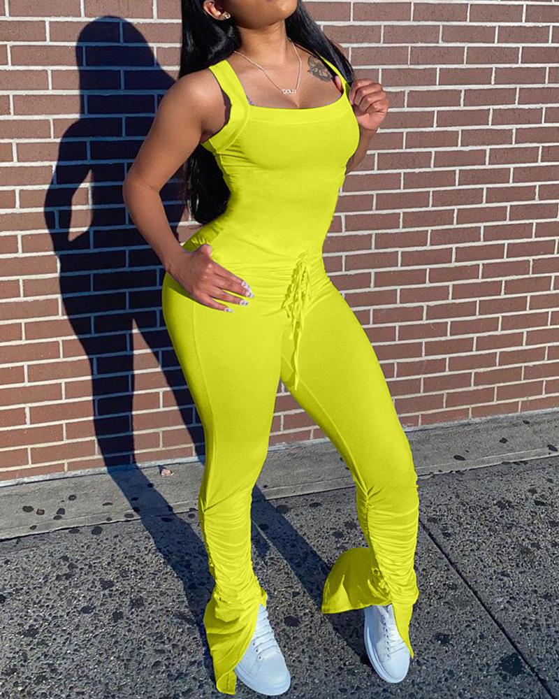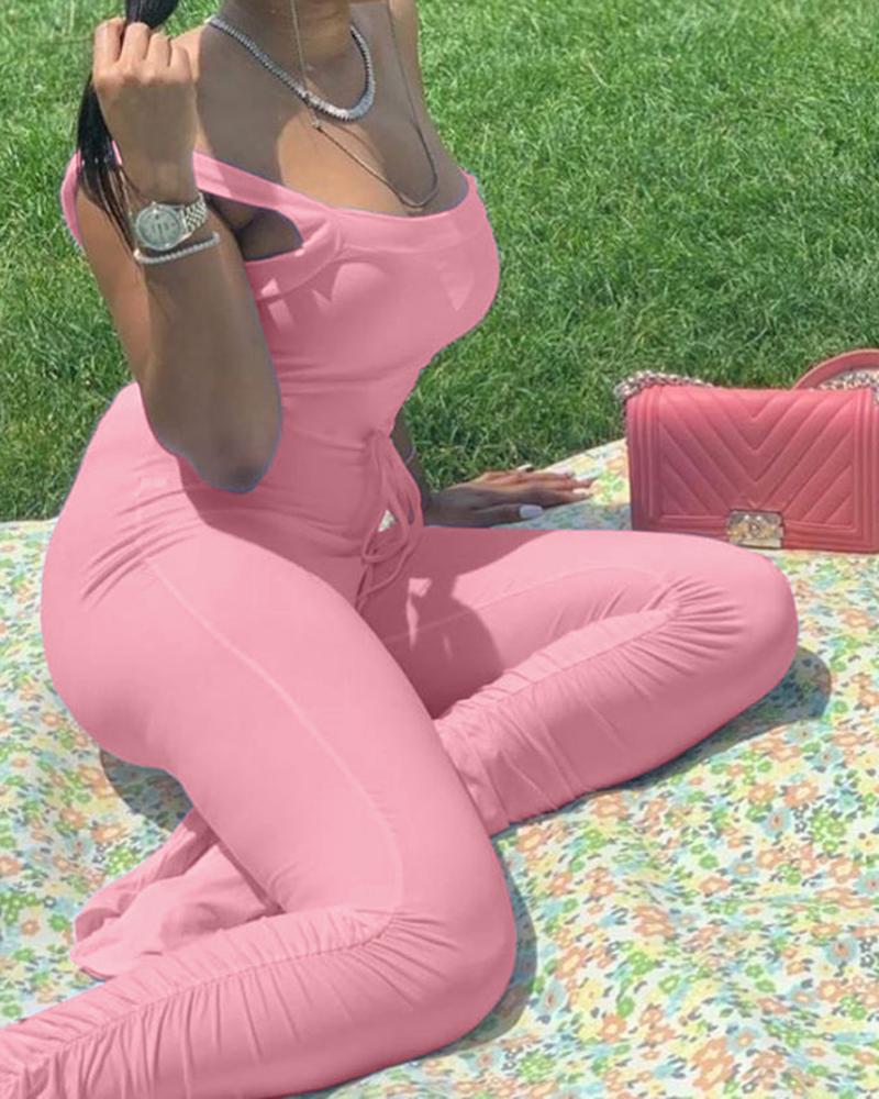Solid Drawstring Waist Ruched Split Hem Straps Casual Jumpsuit